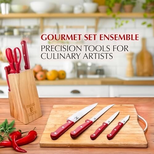 Knife Set, 14-Piece Kitchen Knife Set with Block Wooden German Stainless Steel Description:- Easy Slicing And Dicing: Moss & stone is pleased to offer the best red kitchen knives for the perfect cutting experience. Our stainless steel kitchen knife set with scissors makes cutting, chopping, slicing, and dicing easier, emphasizing your safety to prevent work accidents. Effective Wooden Block Design: Our red knife set with block has a solid, complete design, which prevents blades from falling off. The block will organize your household items in your home kitchen. Powerful & Useful Knife Set Red: Our chef set knifes come in 14 pieces. It includes a sharp and powerful chef knife for correctly and accurately cutting delicate meat steak. It includes all-size knives for everyday use of fruits and vegetables. One Solution For All Your Needs: The complete knives set for kitchen meets all of your food prep needs. As part of the knive set with block, we attach a knife sharpener to maintain the quality; sharpening your nife every often will give you the best result out of your cutting. Easy To Clean Knives: The wooden knife block set is easy to clean and dishwasher safe.