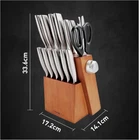 Knife Set, 15-Piece Kitchen Knife Set with Block Wooden German Stainless Steel Description SHARP AND DURABLE: Our knives set are crafted from high-carbon stainless steel with a Rockwell Hardness (HRC) of up to 58, allowing them to handle a variety of ingredients with ease while maintaining their sharp edge over time. SUPERIOR RUST RESISTANCE: Our knives have undergone rigorous salt spray testing, ensuring excellent rust resistance and corrosion protection, so they remain pristine and shiny even after extended use. ERGONOMICALLY DESIGNED HANDLE: The handle of knife is meticulously crafted to fit the contours of the hand, with added weight for a comfortable grip, making it easy to use for extended periods without fatigue. CONVENIENT ACCESSORIES: The knife block comes with a built-in sharpener for hassle-free maintenance, and the set also includes a versatile pair of kitchen shears, perfect for cracking nuts and opening bottle caps. ALL-IN-ONE KITCHEN SET: Our Knife Set include 6 pcs 4.5" steak knives, 8" chef knife, 8" slicing knife, 8" bread knife, 7" santoku knife, 5" utility knife, 3.5" paring knife, 1 kitchen shears and a hardwood knife base with built-in sharpener.