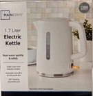 The Mainstays Electric 1.7L Plastic Kettle features easy one-touch operation. Convenient cordless design lifts off the base for easy serving. A concealed heating element and safety-locking lid provides extra security. This kettle is made of high-temperature resistant plastic in a bright white coloration. The large water viewing window makes it easy to see how when you need to refill the water in the kettle. Condition: New Model: 8400778514-3 Electric, 120V/60Hz/1500W Orange indicator light Convenient external semi-transparent water gage Automatic shut off and boil dry protection Safety locking lid 360 degree rotation Cordless, detach from base for ease of use Max capacity 1.7 Liter Concealed heating element Color: White Condition: New Brand: Mainstays Model MS8400778514-3 Content: 1 corded base, cordless Kettle