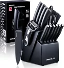 About this item Practibility & Affordability:the Knife set with block contents: 6 Chef's Knives; 8"chef knife; 7"santoku knife; 8"slicing knife; 8"bread knife; 5"utility knife; 3.5"paring knife; 6x4.5"Steak Knife Set; Kitchen Scissors; oak wood knife block, individual sharpener, vegetable peeler, kitchen gadgets holder Cool All-Black Coating: the Knives set made of superiou quality carbon steel & storaged in a cool black knife block with individual sharpener, This Kitchen Knife Set Almost meet your all cutting needs for cooking Block Knife Set: the set of knives for kitchen is optimized with excellent flat-grinding craftmanship and polish-finish,the most advanced edging-crafts Make the knifes razor-sharp, enduring and anti-rust,Dishwasher-safe Full-Features Knives Set: RAXCO Knife Sets with block for kitchen includes 12pieces of kitchen knives, which is an essential for kitchen & Almost meet all the needs for home cooks, Easy to storage and save your space Perfect Complement for Kitchen Decor: RAXCO Knife Set Black with sharpener with all-black coating & cool looks, Fits for various styles of kitchen decor. Meanwhile, the black oxidation coating provide protection the kitchen knives from rusty & corresion, So make the knives set for kitchen durability & longevity Efficeint Storage & Easy Maintenance: this Kitchen Knife Set with a solid wooden block,all kitchen knives & gadgets can be housed in one, Daily Maintence is only keeping the knives clean & dry after use After-Sales Service: RAXCO will provide 24-hour online service. If you have any issues, please contact us promptly; your satisfaction is our priority. Additionally, we offer product technical support