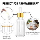 Dropper Bottles 1oz (Clear Glass Bottle 30ml with Golden Caps, Lables & Funnel) Cosmetic Sample Container for Essential Oils, Perfume Premium Quality Dropper Bottle: Our glass pipettes are longer than other brands to prevent wasting oils and thicker to prevent breaking easily. UV Resistant Glass: The amber glass is BPA free and lead-free with UV resistant properties to protect oils from UV rays and evaporation. Perfect for Aromatherapy: Comes with 24 droppers to fill essential oils for massage, hair salon, aromatherapy and relaxation. Leakproof Design: The screw thread finish bottle mouth is matched with a tight aluminum cap to prevent leakage. Additional Accessories: Package includes funnels, pipettes, and stickers to refill and organize essential oils.