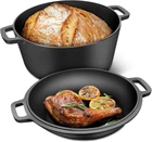 🍳【2-In-1 CAST IRON DUTCH OVEN】The 2-In-1 cast iron dutch oven pot with skillet lid has been burned with high-quality vegetable oil,(no synthetic coatings or chemicals). The shallow skillet that can be used as a lid. The domed pot can be used as a bean pot. Cast iron skillets is tend to get better with age, the more you use it, the better it performs 🥘【ENCLOSED THERMAL CIRCLE】This iron dutch oven pot is design with circulating shower type lid, the raised design of the pot cover allows water vapor to circulate in the pot and locks the nutrition and moisture of the food, evenly fall on the food to maintain the original nutrition, possess pretty heat retention performance. 🔥【SLEEK & ERGONOMIC DESIGN】Cast iron skillet set come with 2 integrated helper handles on each pot and skillet to help you transport your family recipes smoothly and safely to the dinner table. You can easily lift and move the cast iron pot with lid more conveniently. Please notice that wear cooking gloves (not included) when moving pot and skillet as the handle is not anti-scalding. 🧳【SUITABLE FOR ALL STOVES】Our premium Iron Dutch oven is designed to shine on various stovetops, including gas, electric, ceramic, and even induction. Plus, it's oven safe up to 500℉, offering an exceptional range of cooking options. 🧽【EASY TO CLEAN AND MAINTAIN】Just wash the cooker with warm soapy water, and then dry it thoroughly before storage. To protect the appearance of luster, avoid using citrus cleaners. Note: Do not use metal pads or utensils, otherwise the enamel coating will be scratched or broken.
