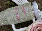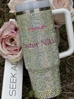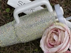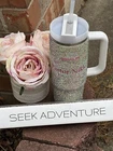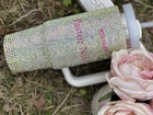 This is a Stanley Cup Custom Bling 2025 20 oz Tumbler with a handle. It features a rhinestone pattern on a white stainless steel body. The tumbler has a drink-through lid, is insulated, and comes with a straw. Suitable for both hot and cold beverages, this tumbler is designed for bottle and food & drink themes. Made in the United States, it is a stylish and functional addition to kitchen and dining accessories.