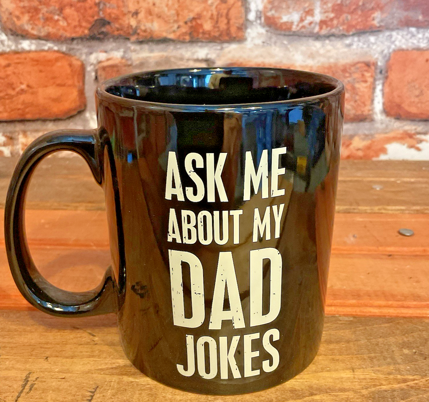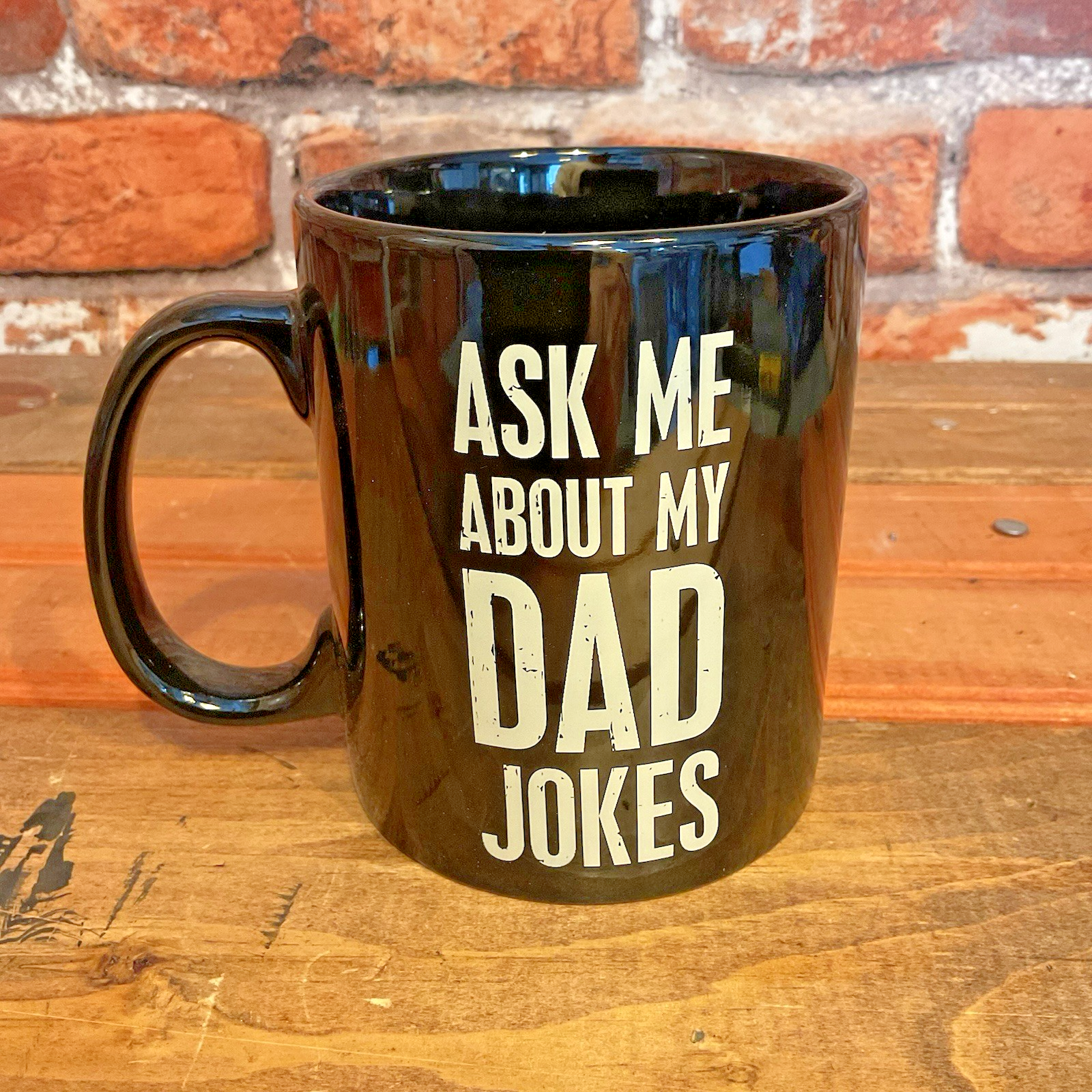 Sip your morning brew in style with the "Ask Me About My Dad Jokes" Coffee Mug, a playful addition to any kitchen or coffee nook. Made by Primitives By Kathy, this mug features a witty White Lettering on a Black background that's sure to spark a conversation among friends and family. The mug has a 20-ounce capacity, perfect for your favorite hot beverage, be it coffee, tea, or hot chocolate. Its sturdy construction ensures that your drinks maintain their temperature while you enjoy the humor it brings to the table. Good in the Microwave and Dishwasher Add a touch of humor to your daily routine with this charming and functional mug.