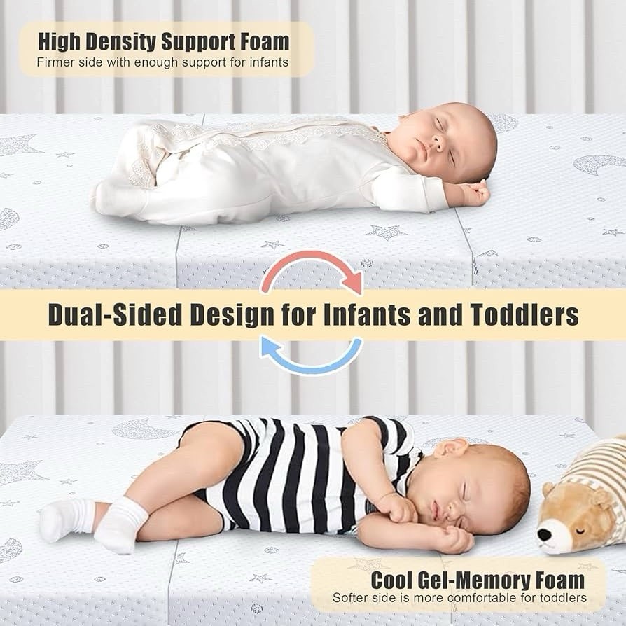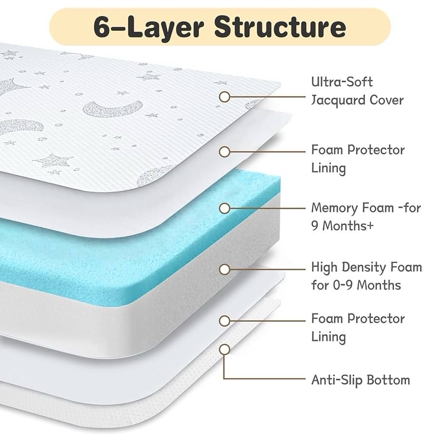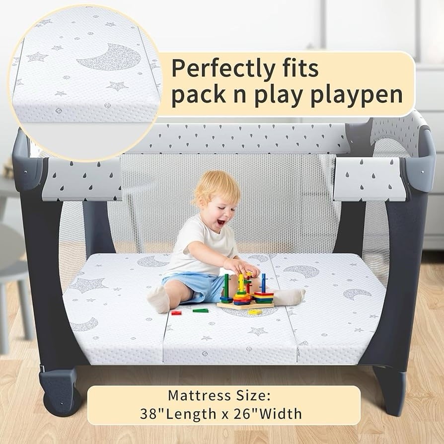 Suitable Size: 38"x26" pack and play mattress comes with 4 rounded edges design, which ensures a tight fit with the four corners of the pack n play and reduces edge gaps, creates a safer playing and sleeping space for your baby. Designed for safer sleep for infants and toddlers. It has a universal size 38x26 inches and fits most brands of pack n play, playpen and playard Dual-Sided for Babies & Toddlers: Our Pack and Play mattress is made up of memory foam and high density foam, making the mattress supportive as well as soft; giving babies comfort and allowing them napping easier. It ensures proper alignment of your newborn’s back and neck, supporting their healthy growth Jacquard Air Layer Fabric: Our baby pack n play mattresses are crafted from premium air layer fabric, it is soft, breathable, skin-friendly, moisture-wicking, and durable. The cover will be zipped off easily for quick cleaning and most dirt wipes away with gentle cleaning. The fabric remains skin-friendly, making it perfect for baby's sensitive skin Safety Comes First: High-density foams in our pack play mattress meet CertiPUR-US standards for content, emissions, free from harmful materials; Highly resilient , breathable and high density foam can make a perfect balance of comfort and support to protect baby's spine and meet their growth needs Portable & Lightweight: Carry bag Included. Trifold and lightweight design allows you to easily fold up and carry your travel mattress for pack and play. Our portable baby mattress for pack n play is not only suitable for indoor use but also convenient for traveling, allowing babies to rest and play comfortably anywhere. The compact size doesn't take up too much space, so it can store in any ideal corner