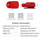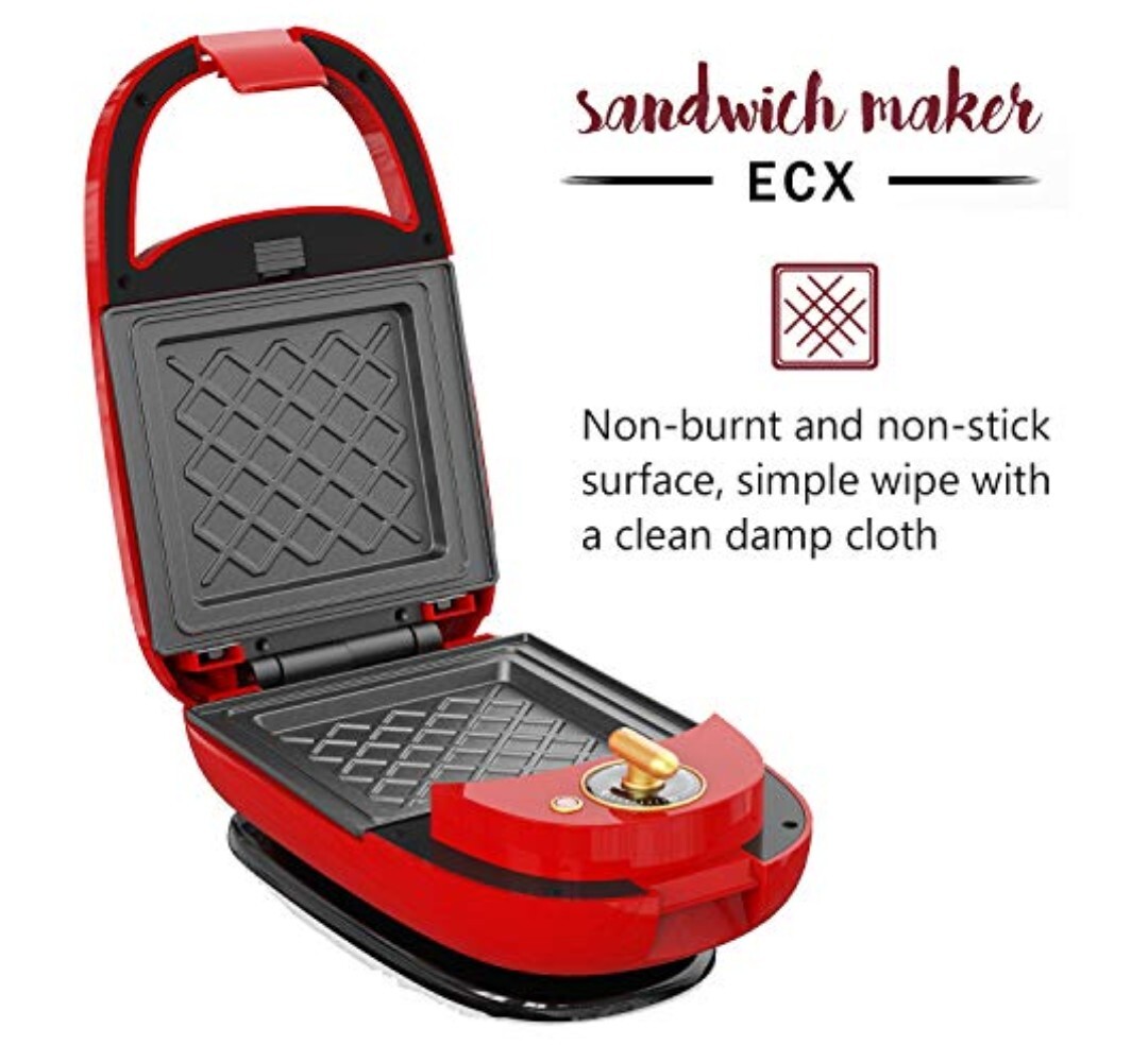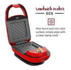 Introducing the versatile 3-in-1 sandwich maker, waffle maker, and donut maker from ECX! This unit is perfect for anyone who loves to experiment with different cooking styles and flavors. With its anti-slip design and non-stick heating plates, you can be assured of delicious results every time. The browning control dial lets you customize the level of crispiness to your liking. This multi-purpose appliance is suitable for all occasions, from a quick breakfast to a hearty brunch with friends. It comes with heating plates and an instruction booklet to get you started. The ECX 3-in-1 sandwich maker is made of durable plastic and weighs 5 lbs. Its vibrant red color and novelty shape make it a fun addition to any kitchen.