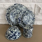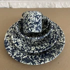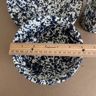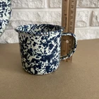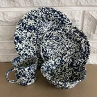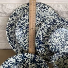 4 Piece Camping Set Enamelware Blue & White Splatter The set includes one 10 1/4" Dinner Plate 2 Bowls one of them is a shallow 8 inch bowl. The other is a 6" cereal type bowl & a coffee mug or cup The condition is good used.
