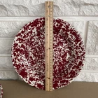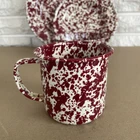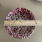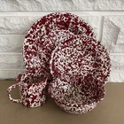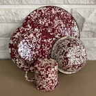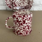 4 Piece Camping Set Enamelware Red & White Splatter The set includes one 10 1/4" Dinner Plate 2 Bowls one of them is a shallow 8 inch bowl. The other is a 6" cereal type bowl & a coffee mug or cup The condition is good used.