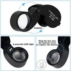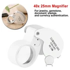 Welcome to Kumbala eBay Store Description: - 100% brand new and high quality - 40X Magnifying Loupe Jewelry Eye Glass Magnifier LED Light Jewelers Loop Pocket W/ - FREE Plastic Storage Case - Colors: Black, Silver - Magnification: 40 X - Lens diameter: 25 MM - Weight: 58 g - Material: aluminum alloy, ABS and Acrylic - Size: 58mm*33mm*25mm - Button Battery: 3 X LR927 (Included) Features: - Wide Application Range: offices, hospitals, schools, printing, homes, electronics, stamps collection, jewelry appraisal, mechanical processing and so on. - Weight: 58 g - Small size, take and keep easily - With LED lights, can use in dark - With 40 X magnification, very clear Battery Placement: - Insert the key attached this product into the two holes of battery cover, turn c ounter clockwise to loosen battery cover, take out old battery and then put new battery inside, finally turn the cover board clockwise to tighten it. Included in this package: - 40 X 25 magnifier X 1 PC - 3X Button batteries (inside) - Please choose your color. Shipped according to your selection Warranty & Customer Service : 30 days money back 60 days seller's guarantee, 24 Hours friendly customer service!