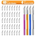 【1】Craft Knife with Extra Blades: Package including 4pcs art knife which is the standard #11 size and comes loaded with a new blade plus 40 more are supplied in four safe storage box. Bright colors (yellow, blue, purple, sliver) makes it easy to find and the tip of the stencil cutting knife is sharp. 【2】Premium Quality: The Aluminum alloy construction is lightweight and robust, ensuring durability even under the pressure of intricate cuts. The handle is ergonomically designed, providing a comfortable grip for extended use. The overall design lends itself well to precision, allowing for controlled and detailed work. 【3】Safely & Portable: 4 Hobby knives each with a safety cap of burin can avoid unnecessary cuts, craft knife cap to prevent scratches. The compact size of exacto knife 4 pack also makes it easy to store in our crafting toolbox or carry with us for on-the-go projects. 【4】Instant Blade Replacement: The blades are very easy to change. We rotate the collar around the blade to loosen the blade, pull the blade out of the handle, insert a new blade in the handle, and tighten the collar around the blade and we're done. 【5】Multi-Purpose Use: Craft knife kit perfect for cutting, carving and trimming, such as cutting thin wood, scrapbooking supplies, cardboard, wallpaper, plastic, cloth, leather and foam board craft, meet our different needs. Great set of exacto blades for hobbiests to proceed all kinds of hobby and craft work.