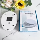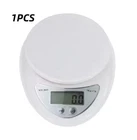 The product is a white digital kitchen scale with a 5kg capacity, suitable for weighing food. It is powered by batteries and features a digital display. The scale is made of stainless steel, plastic, and metal materials, making it durable for kitchen use.