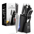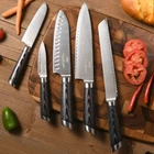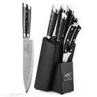 OMPLETE ALL-IN-ONE SET - This professional Damascus knife set includes 8”Chef Knife, 8”Bread Knife, 6.6” Santoku Knife, 5”Utility Knife, 3.5”Paring Knife, Kitchen Shears, all neatly organized in a beautiful wood block PREMIUM CRAFTSMANSHIP - Knives are crafted with VG10 steel core and this central core is encased in 66 layers of steel. After heat treatment and deep cryogenic treatment improves characteristics of the steel. It showcases intricate patterns, excellent cutting performance, and remarkable durability. Our knives boasts an official Rockwell hardness rating of HRC 60 ± 2 for exceptional sharpness and edge retention CONTROL & SHARP - The ergonomic design of the curved handles ensures a comfortable grip and optimal control, allowing you to maneuver through various cutting tasks effortlessly. With our included knife sharpener, you can easily maintain the razor-sharp edge of your knives, ensuring consistent performance over time CONVENIENT CARE & STORAGE - Add a touch of natural beauty to your kitchen with our wooden knife block. Crafted from premium wood, this compact and stylish block securely holds and organizes your knives while protecting their sharp edges. Its durable and easy to clean design ensures long-lasting performance. Also offering a convenient and visually appealing storage solution for these prized knives EXCEPTIONAL SHOPPING EXPERIENCE - Every knife set is backed by superior quality and under strict quality inspection. Our aim is 100% satisfied customers. Please contact us for assistance with any after-sales issues