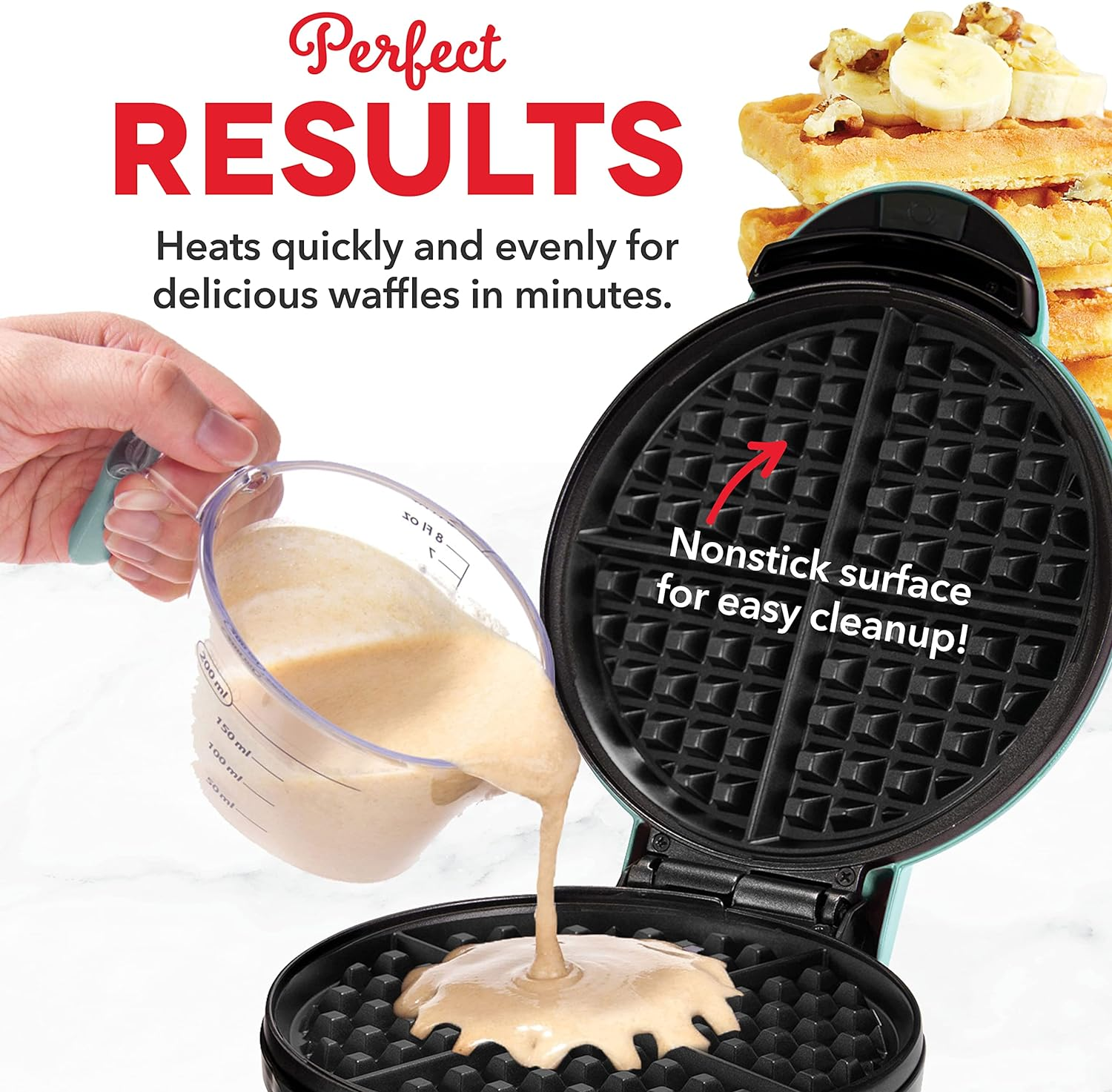 Store New Arrivals Add to Favorite View Feedback Contact 8” Waffle Maker for Waffles, Paninis, Hash Browns & More - Aqua Description Item model number DEWM8100AQ Item Weight 3.5 Pounds Style Waffle Maker Included Components Product, Manual Color Aqua Special Feature Manual Product Dimensions 8"D x 10.5"W x 4.5"H Material Plastic, Metal Country of Origin China Number of settings 1 Global Trade Identification Number 00854940007809 Brand DASH Voltage 110 Material Type Free PFOA Free Size 8 Inch Is Discontinued By Manufacturer No Wattage 1000 watts Manufacturer StoreBound MORE THAN WAFFLES: Make paninis, hash browns, and even biscuit pizzas. Any wet batter will “waffle” your treats and snacks into 4 share size portions Great for kids or on the go. COMPACT plus PORTABLE: 8” Express Waffle Maker takes up minimal counter space and is a MUST-HAVE for that first apartment, smaller kitchen, college dorm life, or camper/RV traveling QUICK plus EASY: Simply plug it in and go; it heats up in mere minutes The dual PFOA-free non-stick surfaces provide an even cook for consistent results, each and every time PERFECT GIFT: The perfect wedding or new home gift Its small size takes up little counter space, and its sleek design and trendy color options will match any kitchen décor (add to your registry now.) INCLUDES: The Express 8” DASH Waffle maker includes anti-slip feet, nonstick heating plates, recipe book Create amazing waffles at home with the DASH Express Waffle Maker! The waffle maker heats quickly and evenly, resulting in perfectly cooked waffles in just a few minutes. Dual non-stick surfaces prevent sticking so waffles lift cleanly. The Express Waffle Maker cooks a delicious 8″ waffle for a single serving breakfast or shareable snack. Great for families with kids, this appliance can also “waffle” hash browns, cookie dough, and more! ABOUT US We offer the best prices around on high quality products. Our E-store includes media such as books, movies, music and games while offering electronics, toys, sporting apparel, clothing, tools, general home, garden items and more. SHIPPING We are always working hard to ensure your package arrives as soon as possible. Please understand that some factors like weather, high postal traffic, and the performance of shipping companies are outside of our control. We offer free shipping to the lower 48 states and ship within 2 business days of payment, usually sooner. We do not accept P.O. Boxes. Please provide a physical address. RETURNS We offer a 30-Day Return Policy on items which you are not completely satisfied with. You have the option for a full-refund or an exchange of the item. No returns are available on items shipped outside of the USA. PAYMENT We accept PayPal. CONTACT US This page content is yet to come Please ad us to your favorite seller and visit again later Thank You CUSTOMER SATISFACTION We try our very best to make sure every customer is completely satisfied. If there's a problem, message us! We're happy to help.