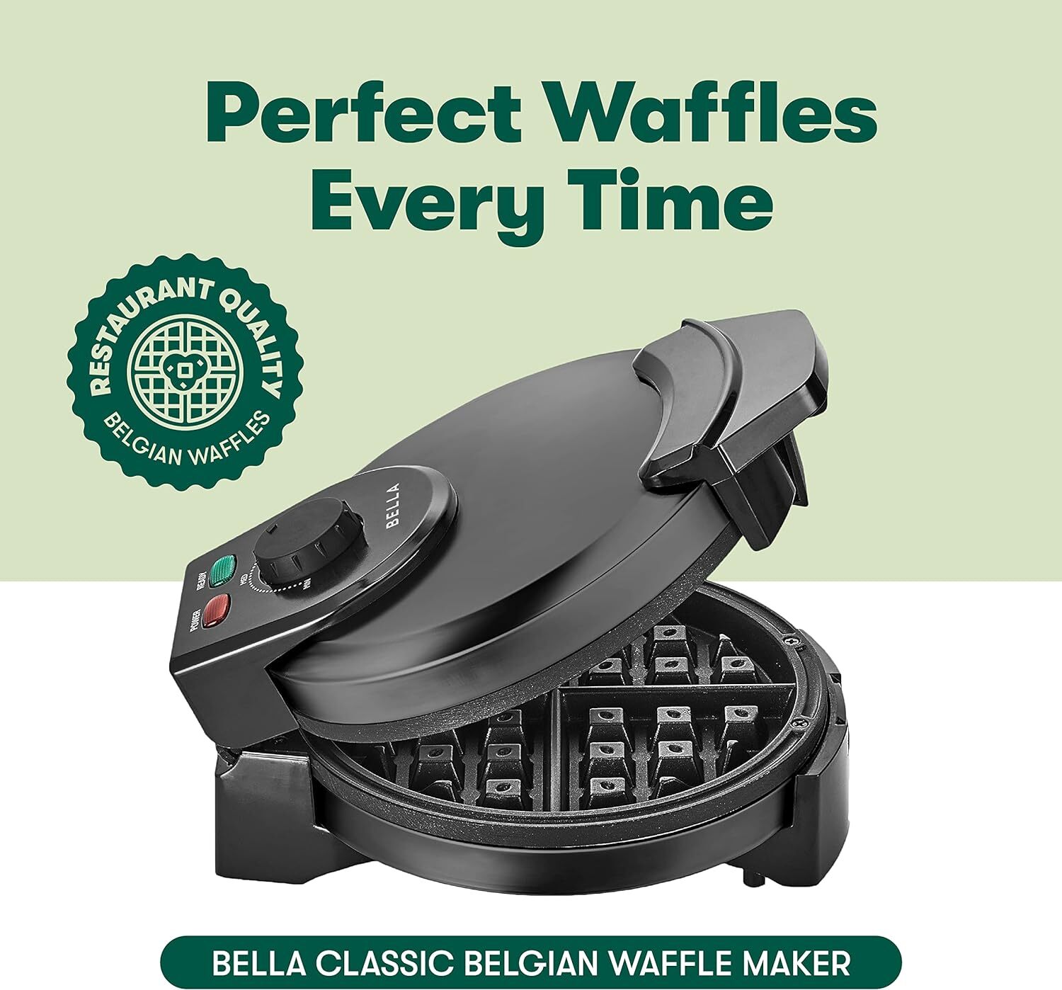 BELLA Classic Belgian Waffle Maker, Nonstick Extra Deep Plates, Black Product Details Special Feature: Manual Color: Black Material: Stainless Steel Brand: BELLA Product Dimensions: 20"D x 56"W x 34"H Wattage: 1100 watts Item Weight: 3.08 Pounds Included Components: waffle maker, 2 Non-marking feet Style: Classic,Cute Voltage: 1.1E+2 Volts UPGRADE YOUR BREAKFAST - BELLA's cute waffle maker is exactly what you need for busy mornings when time is of the essence. Thanks to the extra large double plates you can quickly make round, thick Belgian waffles that are fluffy and delicious every time NO STICKY MESSES - The nonstick coating makes BELLA's waffle irons easy to clean with just a wet wipe. Plus, the PFOA-free coating prevents any harmful chemicals from leaching into your food. With no need for oil or butter, they're a much healthier option NO MORE GUESSWORK - The BELLA waffle maker features an indicator light on the front which lets you know exactly when the unit is preheated and ready to cook. The cool-touch handle prevent scalding when opening the lid, keeping you and your family safe COMPACT DESIGN - Our stainless steel classic waffle maker is cute and small and meant for easy storage. With high-powered 1100-watt quick heating, the waffle iron ensures that your desserts are cooked evenly every time, without any burnt or gooey patches THE PERFECT GIFT - The sleek and trendy style of this small waffle maker will easily match any type of kitchen decor. It is also the best gift idea for many occasions, such as birthdays, Easter and Mother's Day and a great addition to a wedding registry