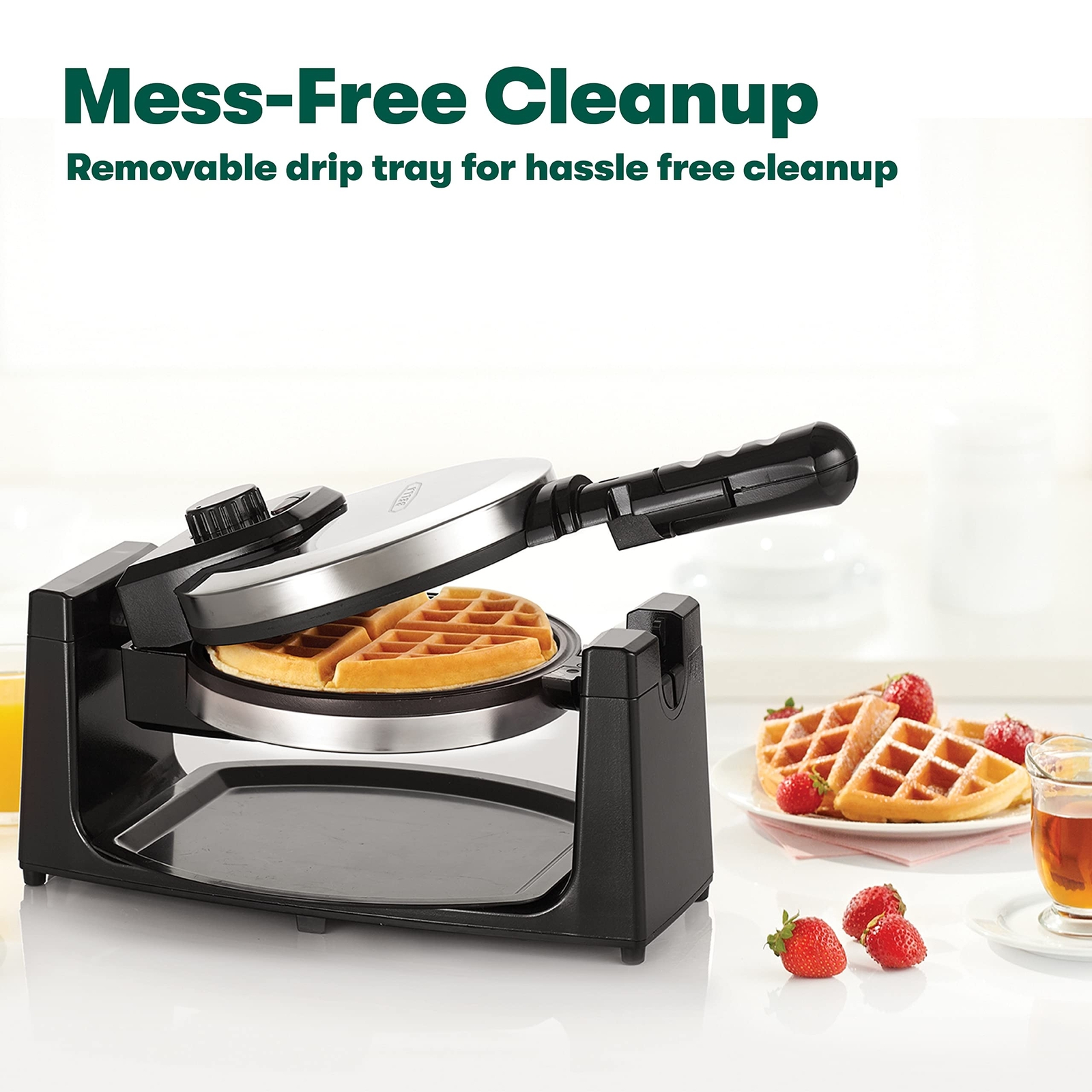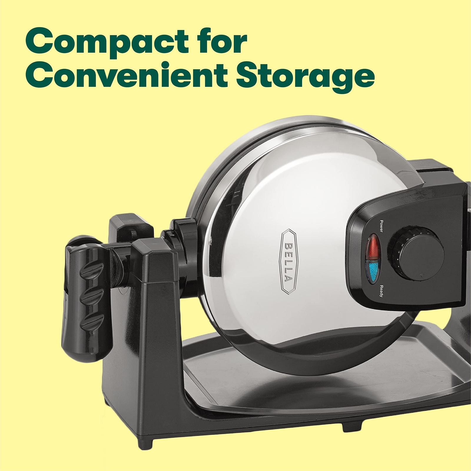 BELLA Classic Rotating Belgian Waffle Maker with Nonstick Plates, Removable Drip Tray, Adjustable Browning Control and Cool Touch Handles, Stainless Steel ✓ Free 60 Day Returns ✓ Free Express Shipping Description: ROTATING WAFFLE MAKER: Enjoy Belgian waffles at home in minutes with this innovative & durable waffle maker, featuring 9 precise browning settings & a rotating function with cool-touch handle that allows you to cook evenly with a flip of the wrist From the Manufacturer Enjoy crisp, delicious Belgian waffles made in your own kitchen with the BELLA Rotating Waffle Maker. This streamlined appliance rotates to cook evenly and allows you to adjust cooking time for each waffle. Cleanup is a breeze with nonstick cooking plates and a drip tray to collect extra batter. Try out the recipes provided for a variety of scrumptious waffles.Rotating Waffle MakerAt a Glance:Waffle maker rotates to cook evenlyControl knob for precise browningNonstick cooking plates and drip tray for simple cleanupAuto-locking mechanism prevents spillsFolding handle makes storage convenientMake evenly cooked Belgian waffles with all of your favorite toppings.Evenly Cooks Belgian Waffles to Desired Level of BrowningWith a rotating function that allows for even cooking, the Rotating Waffle Maker produces waffles with uniform crispness. The browning control dial offers nine settings, so you can precisely cook your waffles to the level of darkness you prefer. The Rotating Waffle Maker's ready light indicates when it has reached the proper initial cooking temperature and lights again when your waffle has been cooked to your specification.Nonstick Surface for Easy Waffle Removal and CleanupWaffles come out intact thanks to nonstick cooking plates in the Rotating Waffle Maker. Their nonstick surface minimizes mess left on the plates. Simply wipe the cooled cooking surface with a soft cloth to clean. The removable drip tray catches runoff batter and crumbs.Auto-Lock and Nonslip Feet Prevent SpillsThe auto-locking mechanism holds the waffle maker upright as you pour in batter and locks it closed while it rotates to help prevent spills. Nonslip feet slide open to help prevent accidents on the countertop.Handle Folds for Compact StorageThe folding handle makes it convenient to store the Rotating Waffle Maker until the next time you crave homemade waffles.Enjoy Any Waffle Recipe, Any Time You WantWho says waffles are just for breakfast? With the BELLA Rotating Waffle Maker, you can enjoy fresh Belgian waffles morning, noon, or night, and the toppings options are nearly endless. Go with classic butter and syrup, or try some fresh strawberries of blueberries. For a savory variation, pair your waffles with some fried chicken. Or if you're in the mood for dessert, try chocolate chips and whipped cream.What's in the BoxRotating Waffle Maker, drip tray, detachable power cord, and instruction manual with recipes.Recipe Suggestion: Corn Waffles2 (8-1/2-oz) packages corn muffin mix2 eggs1/4 cup vegetable oil2 Tbsp. honey1-1/2 cups milk1 (15-oz) can whole kernel corn, drained2 (4-oz) cans chopped green chilies, drained2 cups grated cheese (American or Monterey Jack)1/2 tsp. cayenne pepper (optional)Condition and preheat Rotating Belgium Waffle Maker.Use a spoon to stir corn muffin mix, cayenne, eggs, vegetable oil, and milk together. The batter will be slightly lumpy.Stir in corn, chilies and cheese.Pour approximately 3/4 to 1 cup of batter onto the lower cooking plate. Close the lid, turn the temperature control dial to medium (4) setting, and bake.When a waffle is done, the top cooking plate should lift easily. Lift the plate gently; if it pulls, continue cooking for 1 minute and test again.If necessary, adjust cooking dial for future waffle baking and repeat with remaining batter.The browning control dial offers nine settings.An auto-locking mechanism keeps the lid upright as you pour in batter.The waffle maker rotates to cook evenly.Nonstick cooking plates help waffles come out intact. Features: VERSATILE COOKING: With 3 different non-stick coatings, from traditional to ceramic titanium, this waffle iron allows you to cook up a variety of scrumptious treats beyond just waffles. From pancakes to hash browns, let your culinary creativity soar! FAMILY-SIZED DELIGHT: The large capacity of this rotating waffle maker ensures that you can make plenty of delicious Belgian waffles to feed your family and guests. Start your morning with a hot, fresh batch of perfectly golden, fluffy deliciousness! FLIPPING PERFECT: The rotating function of this double waffle maker guarantees even cooking and with 9 browning control settings you're sure to get the dessert of your dreams every time. Plus, the cool-touch handle makes flipping a breeze EASY CLEANUP: Say goodbye to messy batter and hello to easy cleanup with smooth auto-lock cooking surfaces and a dishwasher safe removable drip tray. The non-slip feet keep our waffle irons securely in place, protecting your countertop from any spills ELEGANT & COMPACT: The sleek design and folding handle make our cute waffle makers the perfect fit for any kitchen decor, plus the compact size makes them easy to store away. They're also a great gift idea and a nice addition to your wedding registry Product Details: Special Feature: Manual Color: Stainless Steel Material: Plastic Brand: BELLA Product Dimensions: 6.69"D x 15.35"W x 9.96"H Wattage: 1000 watts Item Weight: 5 Pounds Included Components: BELLA Classic Rotating Belgian Waffle Maker, Polished Stainless Steel Style: Maker Voltage: 120 Volts Special Feature: Manual Color: Stainless Steel Material: Plastic Brand: BELLA Product Dimensions: 6.69"D x 15.35"W x 9.96"H Wattage: 1000 watts Item Weight: 5 Pounds Included Components: BELLA Classic Rotating Belgian Waffle Maker, Polished Stainless Steel Style: Maker Voltage: 120 Volts Material Type Free: PFOA Free Number of settings: 9 Item Weight: 5 pounds Department: Kitchen Manufacturer: BELLA Domestic Shippin
