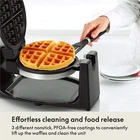 VERSATILE COOKING: With 3 different non-stick coatings, from traditional to ceramic titanium, this waffle iron allows you to cook up a variety of scrumptious treats beyond just waffles. From pancakes to hash browns, let your culinary creativity soar! FAMILY-SIZED DELIGHT: The large capacity of this rotating waffle maker ensures that you can make plenty of delicious Belgian waffles to feed your family and guests. Start your morning with a hot, fresh batch of perfectly golden, fluffy deliciousness! FLIPPING PERFECT: The rotating function of this double waffle maker guarantees even cooking and with 9 browning control settings you're sure to get the dessert of your dreams every time. Plus, the cool-touch handle makes flipping a breeze EASY CLEANUP: Say goodbye to messy batter and hello to easy cleanup with smooth auto-lock cooking surfaces and a dishwasher safe removable drip tray. The non-slip feet keep our waffle irons securely in place, protecting your countertop from any spills ELEGANT & COMPACT: The sleek design and folding handle make our cute waffle makers the perfect fit for any kitchen decor, plus the compact size makes them easy to store away. They're also a great gift idea and a nice addition to your wedding registry Product Description Love waffles? Same. The bella Classic Waffle Iron Toaster delivers crispy, mouthwatering waffles faster than you can eat them (in 6 minutes to be exact). Power up this rotating waffle maker to streamline the morning dash to school, work or whatever else your busy day has in store. It has 9 precise browning settings for a custom cook and the rotating function with cool-touch handle allows you to cook evenly with a flip of the wrist. Plus, the nonstick coating makes the bella waffle iron easy to clean with just a damp cloth. The built-in power and ready indicator lights let you know when the waffle maker is hot, and the extra deep pockets cook up waffles perfect for a variety of toppings, such as fresh berries, melted butter, ice cream and maple syrup. The cool-touch handles and locking latch make it safe and easy to store, while the compact design allows you to stand it up vertically to save space. Plus, the dual PFOA-free and nonstick surfaces result in fluffy and tender waffles that are crispy on the outside and golden brown on the inside. From the Manufacturer Enjoy crisp, delicious Belgian waffles made in your own kitchen with the BELLA Rotating Waffle Maker. This streamlined appliance rotates to cook evenly and allows you to adjust cooking time for each waffle. Cleanup is a breeze with nonstick cooking plates and a drip tray to collect extra batter. Try out the recipes provided for a variety of scrumptious waffles. Rotating Waffle Maker At a Glance: Waffle maker rotates to cook evenly Control knob for precise browning Nonstick cooking plates and drip tray for simple cleanup Auto-locking mechanism prevents spills Folding handle makes storage convenient Make evenly cooked Belgian waffles with all of your favorite toppings. Evenly Cooks Belgian Waffles to Desired Level of Browning With a rotating function that allows for even cooking, the Rotating Waffle Maker produces waffles with uniform crispness. The browning control dial offers nine settings, so you can precisely cook your waffles to the level of darkness you prefer. The Rotating Waffle Maker's ready light indicates when it has reached the proper initial cooking temperature and lights again when your waffle has been cooked to your specification. Nonstick Surface for Easy Waffle Removal and Cleanup Waffles come out intact thanks to nonstick cooking plates in the Rotating Waffle Maker. Their nonstick surface minimizes mess left on the plates. Simply wipe the cooled cooking surface with a soft cloth to clean. The removable drip tray catches runoff batter and crumbs. Auto-Lock and Nonslip Feet Prevent Spills The auto-locking mechanism holds the waffle maker upright as you pour in batter and locks it closed while it rotates to help prevent spills. Nonslip feet slide open to help prevent accidents on the countertop. Handle Folds for Compact Storage The folding handle makes it convenient to store the Rotating Waffle Maker until the next time you crave homemade waffles. Enjoy Any Waffle Recipe, Any Time You Want Who says waffles are just for breakfast? With the BELLA Rotating Waffle Maker, you can enjoy fresh Belgian waffles morning, noon, or night, and the toppings options are nearly endless. Go with classic butter and syrup, or try some fresh strawberries of blueberries. For a savory variation, pair your waffles with some fried chicken. Or if you're in the mood for dessert, try chocolate chips and whipped cream. What's in the Box Rotating Waffle Maker, drip tray, detachable power cord, and instruction manual with recipes. Recipe Suggestion: Corn Waffles 2 (8-1/2-oz) packages corn muffin mix 2 eggs 1/4 cup vegetable oil 2 Tbsp. honey 1-1/2 cups milk 1 (15-oz) can whole kernel corn, drained 2 (4-oz) cans chopped green chilies, drained 2 cups grated cheese (American or Monterey Jack) 1/2 tsp. cayenne pepper (optional) Condition and preheat Rotating Belgium Waffle Maker. Use a spoon to stir corn muffin mix, cayenne, eggs, vegetable oil, and milk together. The batter will be slightly lumpy. Stir in corn, chilies and cheese. Pour approximately 3/4 to 1 cup of batter onto the lower cooking plate. Close the lid, turn the temperature control dial to medium (4) setting, and bake. When a waffle is done, the top cooking plate should lift easily. Lift the plate gently; if it pulls, continue cooking for 1 minute and test again. If necessary, adjust cooking dial for future waffle baking and repeat with remaining batter. The browning control dial offers nine settings. An auto-locking mechanism keeps the lid upright as you pour in batter. The waffle maker rotates to cook evenly. Nonstick cooking plates help waffles come out intact.