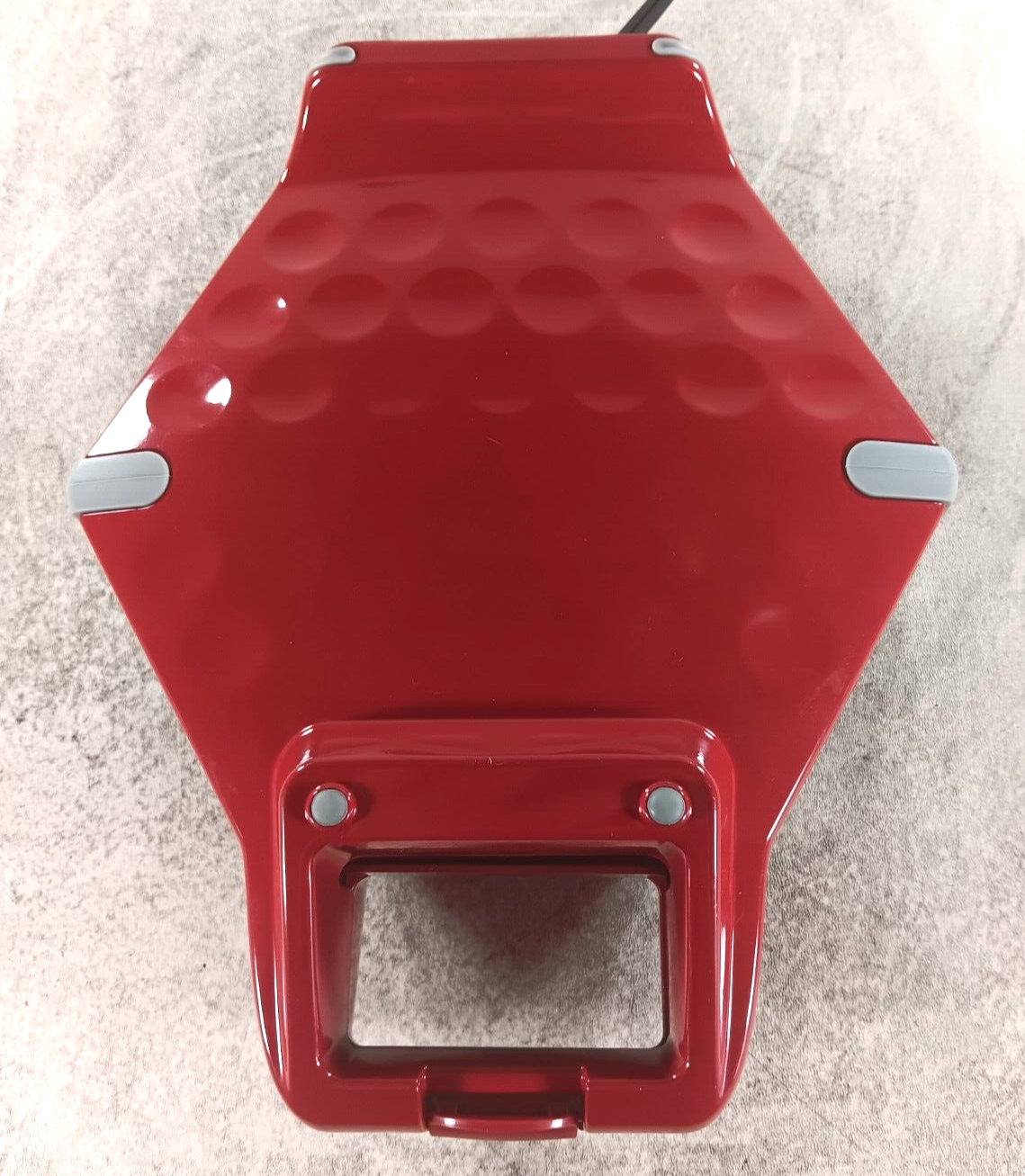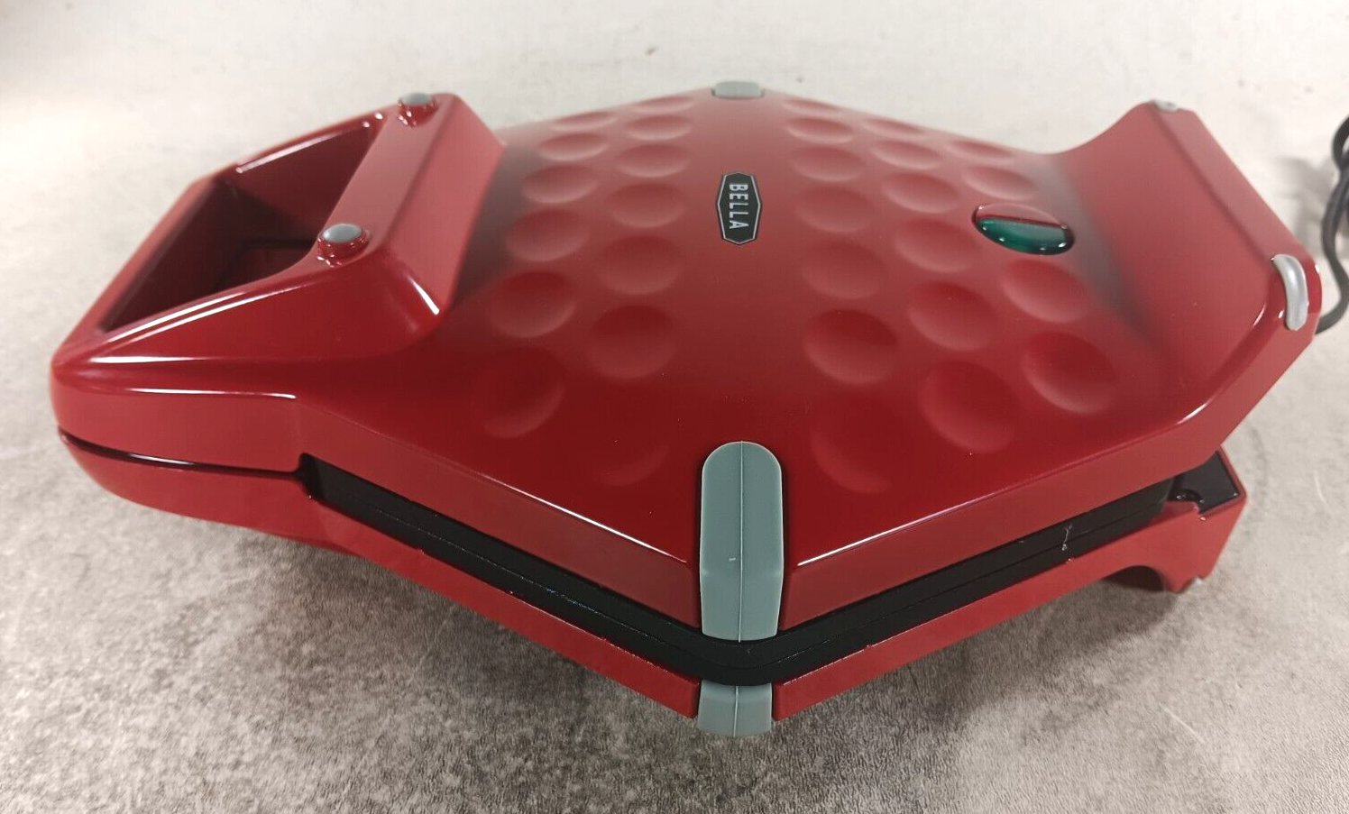 The Bella Bubble Waffle Maker is a red novelty electric unit that can make authentic bubble waffles at home. It has a 9" width and features indicator lights, a heat-resistant handle, easy cleaning, non-stick surfaces, and automatic operation. Made of plastic, it has a power of 800W and operates on 120V. The unit includes recipes and is manufactured in China under the Bella brand.