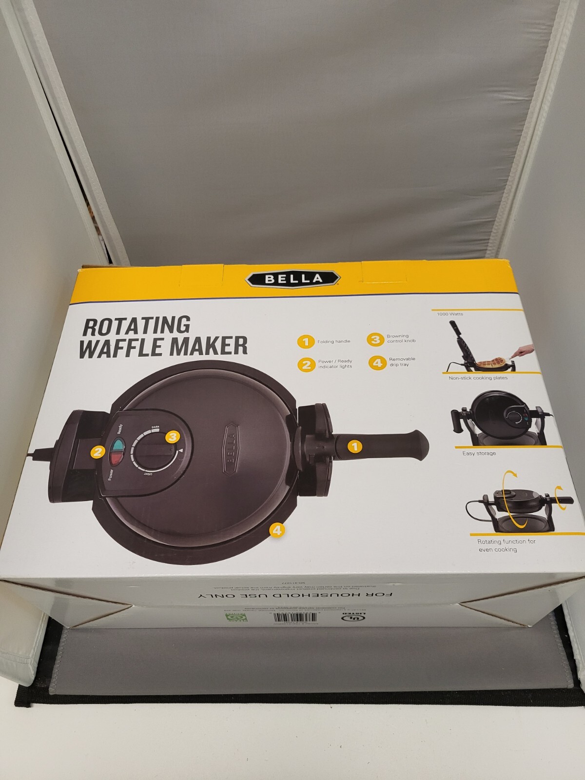 Enjoy the perfect breakfast treat with this Rotating Belgian Waffle Maker BELLA Classic Pro Black. The round waffle maker is designed for easy food release and effortless cleaning, thanks to its non-stick coating. With its 1000 W power, you can cook perfect waffles every time, and the removable drip tray makes cleaning a breeze. This compact waffle maker is easy to store and comes with a handle, non-stick pan, recipes, and an instruction manual. The indicator light allows for perfect cooking every time, and the waffle maker is designed for easy use with a 110 V power source. Made in Canada, this waffle maker is a must-have for any kitchen.