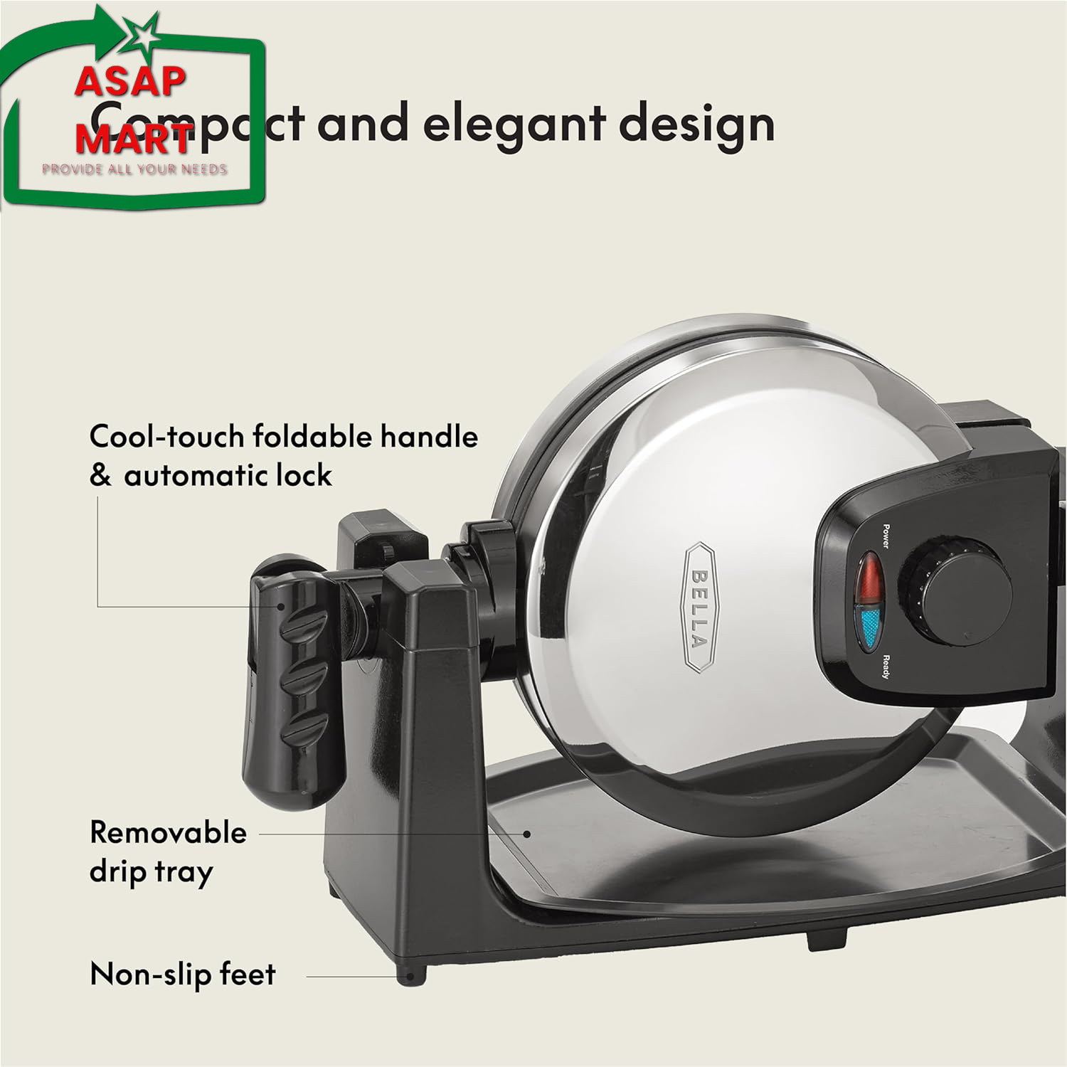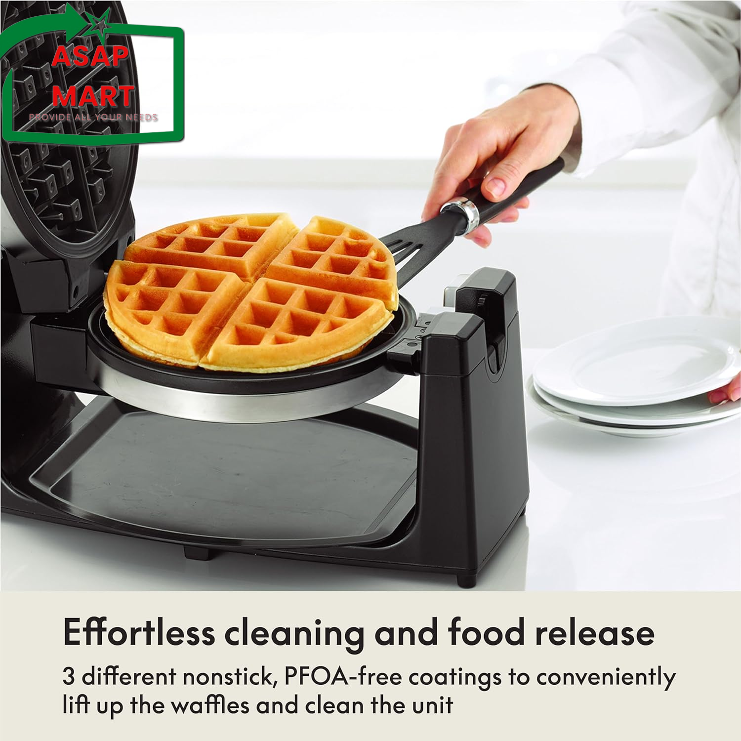 VERSATILE COOKING: With 3 different non-stick coatings, from traditional to ceramic titanium, this waffle iron allows you to cook up a variety of scrumptious treats beyond just waffles. From pancakes to hash browns, let your culinary creativity soar! FAMILY-SIZED DELIGHT: The large capacity of this rotating waffle maker ensures that you can make plenty of delicious Belgian waffles to feed your family and guests. Start your morning with a hot, fresh batch of perfectly golden, fluffy deliciousness! FLIPPING PERFECT: The rotating function of this double waffle maker guarantees even cooking and with 9 browning control settings you're sure to get the dessert of your dreams every time. Plus, the cool-touch handle makes flipping a breeze EASY CLEANUP: Say goodbye to messy batter and hello to easy cleanup with smooth auto-lock cooking surfaces and a dishwasher safe removable drip tray. The non-slip feet keep our waffle irons securely in place, protecting your countertop from any spills ELEGANT & COMPACT: The sleek design and folding handle make our cute waffle makers the perfect fit for any kitchen decor, plus the compact size makes them easy to store away. They're also a great gift idea and a nice addition to your wedding registry Product Description Love waffles? Same. The bella Classic Waffle Iron Toaster delivers crispy, mouthwatering waffles faster than you can eat them (in 6 minutes to be exact). Power up this rotating waffle maker to streamline the morning dash to school, work or whatever else your busy day has in store. It has 9 precise browning settings for a custom cook and the rotating function with cool-touch handle allows you to cook evenly with a flip of the wrist. Plus, the nonstick coating makes the bella waffle iron easy to clean with just a damp cloth. The built-in power and ready indicator lights let you know when the waffle maker is hot, and the extra deep pockets cook up waffles perfect for a variety of toppings, such as fresh berries, melted butter, ice cream and maple syrup. The cool-touch handles and locking latch make it safe and easy to store, while the compact design allows you to stand it up vertically to save space. Plus, the dual PFOA-free and nonstick surfaces result in fluffy and tender waffles that are crispy on the outside and golden brown on the inside. From the Manufacturer Enjoy crisp, delicious Belgian waffles made in your own kitchen with the BELLA Rotating Waffle Maker. This streamlined appliance rotates to cook evenly and allows you to adjust cooking time for each waffle. Cleanup is a breeze with nonstick cooking plates and a drip tray to collect extra batter. Try out the recipes provided for a variety of scrumptious waffles. Rotating Waffle Maker At a Glance: Waffle maker rotates to cook evenly Control knob for precise browning Nonstick cooking plates and drip tray for simple cleanup Auto-locking mechanism prevents spills Folding handle makes storage convenient Make evenly cooked Belgian waffles with all of your favorite toppings. Evenly Cooks Belgian Waffles to Desired Level of Browning With a rotating function that allows for even cooking, the Rotating Waffle Maker produces waffles with uniform crispness. The browning control dial offers nine settings, so you can precisely cook your waffles to the level of darkness you prefer. The Rotating Waffle Maker's ready light indicates when it has reached the proper initial cooking temperature and lights again when your waffle has been cooked to your specification. Nonstick Surface for Easy Waffle Removal and Cleanup Waffles come out intact thanks to nonstick cooking plates in the Rotating Waffle Maker. Their nonstick surface minimizes mess left on the plates. Simply wipe the cooled cooking surface with a soft cloth to clean. The removable drip tray catches runoff batter and crumbs. Auto-Lock and Nonslip Feet Prevent Spills The auto-locking mechanism holds the waffle maker upright as you pour in batter and locks it closed while it rotates to help prevent spills. Nonslip feet slide open to help prevent accidents on the countertop. Handle Folds for Compact Storage The folding handle makes it convenient to store the Rotating Waffle Maker until the next time you crave homemade waffles. Enjoy Any Waffle Recipe, Any Time You Want Who says waffles are just for breakfast? With the BELLA Rotating Waffle Maker, you can enjoy fresh Belgian waffles morning, noon, or night, and the toppings options are nearly endless. Go with classic butter and syrup, or try some fresh strawberries of blueberries. For a savory variation, pair your waffles with some fried chicken. Or if you're in the mood for dessert, try chocolate chips and whipped cream. What's in the Box Rotating Waffle Maker, drip tray, detachable power cord, and instruction manual with recipes. Recipe Suggestion: Corn Waffles 2 (8-1/2-oz) packages corn muffin mix 2 eggs 1/4 cup vegetable oil 2 Tbsp. honey 1-1/2 cups milk 1 (15-oz) can whole kernel corn, drained 2 (4-oz) cans chopped green chilies, drained 2 cups grated cheese (American or Monterey Jack) 1/2 tsp. cayenne pepper (optional) Condition and preheat Rotating Belgium Waffle Maker. Use a spoon to stir corn muffin mix, cayenne, eggs, vegetable oil, and milk together. The batter will be slightly lumpy. Stir in corn, chilies and cheese. Pour approximately 3/4 to 1 cup of batter onto the lower cooking plate. Close the lid, turn the temperature control dial to medium (4) setting, and bake. When a waffle is done, the top cooking plate should lift easily. Lift the plate gently; if it pulls, continue cooking for 1 minute and test again. If necessary, adjust cooking dial for future waffle baking and repeat with remaining batter. The browning control dial offers nine settings. An auto-locking mechanism keeps the lid upright as you pour in batter. The waffle maker rotates to cook evenly. Nonstick cooking plates help waffles come out intact.