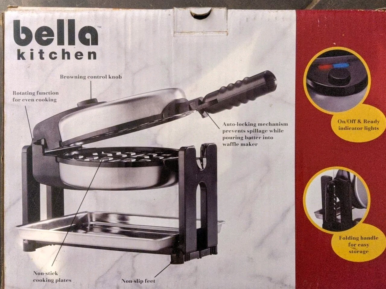 BELLA ROTATING BELGIAN WAFFLE MAKER 15063 Used Box shows handling wear. Pre Owned.