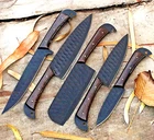 CUSTOM HAND MADE CARBON STEEL BLADE CHEF KNIFE KITCHEN KNIVES SET Wood Handle This superb design knifes is hand made. Blade of this knife has a nice file work and is made of high carbon steel and hardness 55-58 H R C . This robust knife is lab tested under intense conditions, the balance and shape of this knife ensures perfect grip. Overall Pieces : 5 Cleaver Knife : Blade 6" Inches - Handle 4.75" Inches Fillet Knife : Blade 7.25" Inches - Handle 4.75" Inches Chef Knife : Blade 6.5" Inches - Handle 4.75" Inches Paring Knife : Blade 3.5" Inches - Handle 4.5" Inches Steak Knife : Blade 4.5" Inches - Handle 4.5" Inches Package Includes: with Leather Sheath Bag Warning: Keep fingers clear of blades. Store away from children.