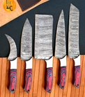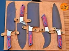 CUSTOM HAND MADE FORGED DAMASCUS STEEL BLADE CHEF KITCHEN KNIFE SET Wood & Steel Bolster Handle This superb design knifes is hand forged. Blade of this knife has a nice file work and is made of 512 layers of 4340 stainless steel and 1075 high carbon steel and hardness 55-58 H R C . This robust knife is lab tested under intense conditions, the balance and shape of this knife ensures perfect grip. Overall Pieces : 5 Bread Knife : Blade 6.5" Inches - Handle 5.25" Inches Cleaver Knife : Blade 6" x 2.5" Inches - Handle 5.5" Inches Chef Knife : Blade 7" Inches - Handle 4.5" Inches Peel Knife : Blade 3.25" Inches - Handle 4.5" Inches Steak Knife : Blade 6" Inches - Handle 4.5" Inches Damascus Design: Twist Pattern Layers:512 Package Includes: with Sheath Care Instructions: Keep the knife dry after each cleaning. Warning: Keep fingers clear of blades. Store away from children.