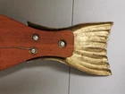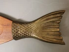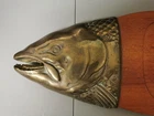 Mid Century Fish Serving Board Wall Sculpture Tray Salmon Brass & Wood. In used good vintage condition. Approx. 36 inches in length and 7.5 inches wide at it widest point. Weighs approx. 7.25 lbs.