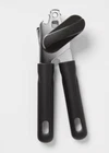 New Can Opener with Bottle Opener. Black. Room Essentials. A great can opener to have on hand for opening tin cans. Eco friendly - not electric. easy to store. Put it in Emergency Preparedness Kit. Comes with packaging. The canopener handles have holes to allow for hanging in your kitchen.