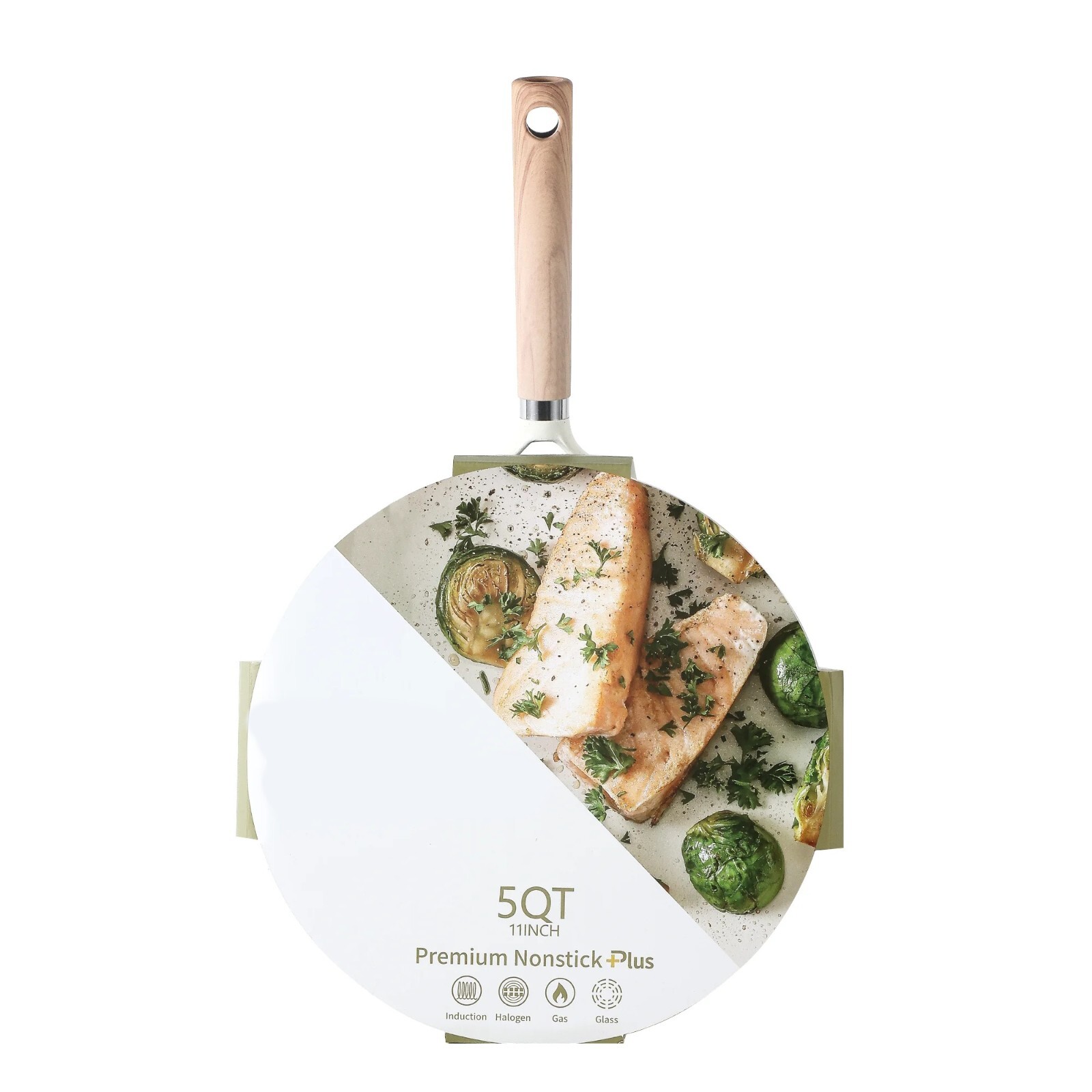 Why Carote? Enjoy the Best Quality. Carote is committed to offering you the best quality at the fairest and most honest price, with 25 years of experience in the nonstick cookware industry. We sell directly from our factory. A typical M13C model allows us to offer the lowest cost with higher quality products. We always adhere to the principle of customer first, pay attention to the customer's shopping experience, and provide excellent service to ensure each customer receives the best value for their money. STURDY BODY - Made of heavy-duty cast aluminum, this nonstick pan resists warping and wobbling while heating quickly and evenly. SUPER NONSTICK: This sauté pan features a premium nonstick coating in creamy white with speckles and a sleek granite look, making cooking and cleanup a breeze. Food slides off easily, and less oil or butter is needed, promoting healthier cooking. EASY TO CLEAN - The non-stick surface and soft-touch Bakelite handle make cleaning a breeze, saving you time and effort in the kitchen. COMFORTABLE HANDLE - Sturdy round handle with safe flame guard ring for comfortable and safe cooking COMPATIBLE WITH ALL STOVETOPS - The stainless steel induction base is suitable for gas, induction, electric, and ceramic stovetops. VISIBLE COOKING - The clear tempered glass lid allows easy monitoring of cooking progress LARGE CAPACITY -5.0 QUART, 11 inch/28 cm diameter, perfect for preparing meals for family and friends gathering. Features Nonstick, Induction Compatible Brand Carote Cleaning, Care & Maintenance Just gently wipe it with a paper towel or rinse it with water Assembled Product Dimensions (L x W x H) 19.09 x 11.42 x 3.35 Inches
