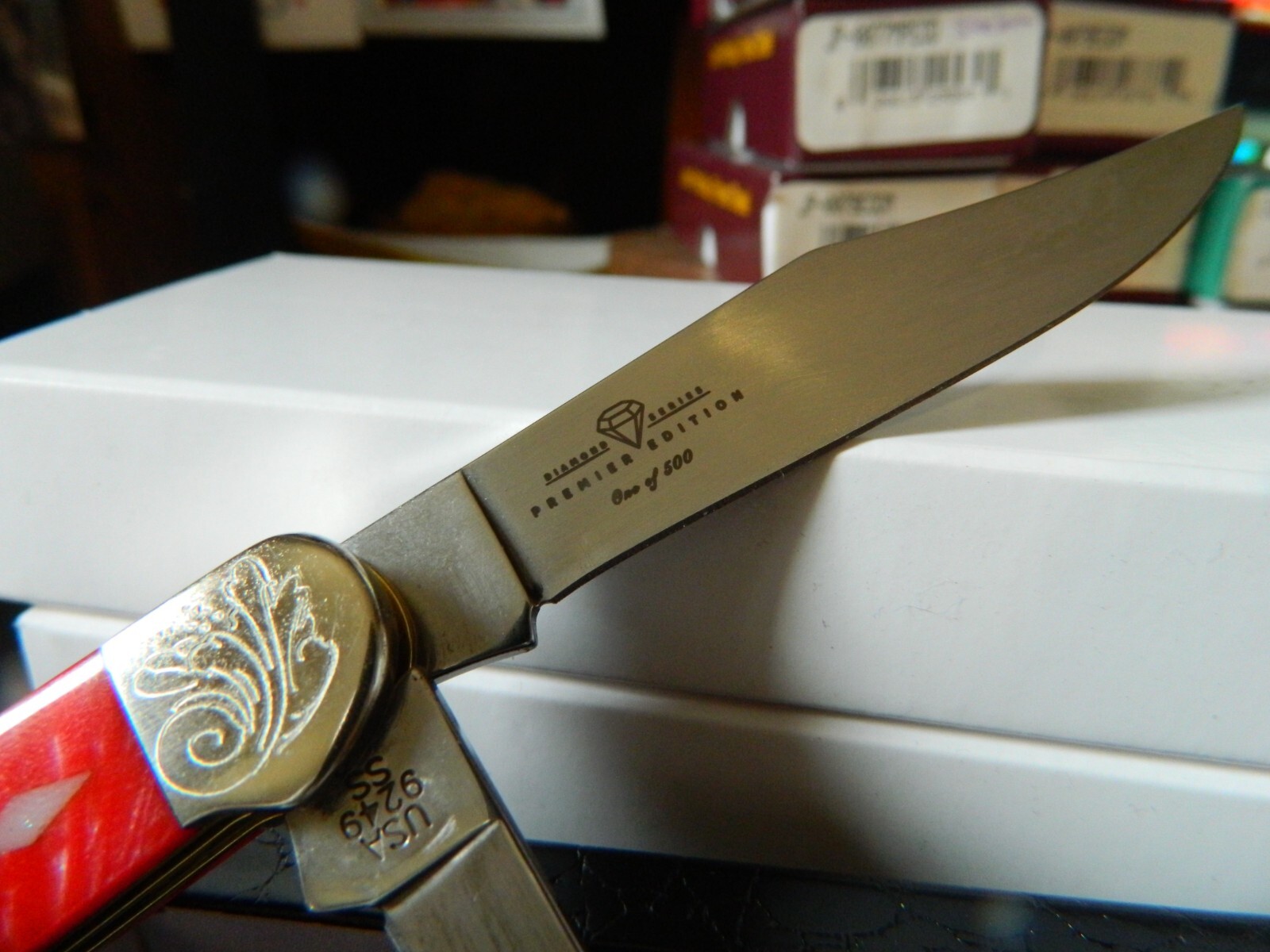CASE & SONS CUTLERY , Just made 500 ,- 4" COPPERHEAD Pocket Knives called * ENGRAVED BOLSTER SERIES * DIAMOND SERIES PREMIER EDITION 1 OF 500 is etched on the Clip Point Blade. Stamped is CASE MMXXI USA. On the Spear Point Blade is USA 9249 SS. If you look at the Bolsters you can see they are Engraved by Hand, all four bolsters have a design done by one of the craftsman at Case. I put many pictures of one of the five knives we got. What Case has done was picked a Corelon or synthetic scale with its own design these are their *Red & White Diamond scale* , they also have a Blue Diamond and a Green Diamond pattern again all with hand engraved bolsters. We had five of each of those , Case made 5 different colors that we know of and we are buying what we can. This knife is new for us today 2/2/25. They are all Copperhead Knives. Model # 9249RDWP/DE, Weight 3.0oz. with display case 6.8oz. The bolsters are not smooth you can feel these were engraved. and if you are wondering on the certificate of authenticity Engraoed Bolsters, if the spelling was right,- Yes. It is one more reason these are a Limited Edition Custom Hand-Made Knife, we looked for the spelling and found this. The first 20 knives we got Case had a spelling error on the Cert. it appears this was fixed but we have not checked each knife as of yet. Scrolled Bolsters The bolsters are scrolled on both the top and bottom of both sides of the knife. The exquisitely scrolled bolsters add a sparkle and gleam that is unmatched by any other knife. This brand new series of Case knives comes in a Black Display Case. We made sure you can see the display case in the pictures we put in the listing. We could only get 5 of these 9249RDWP/DE. Again we have just five of these knives, and we will give you $$$$$$$$$$$$ FREE SHIPPING $$$$$$$$$$$$$$$$$$ to help you get one. WE THANK YOU AND GOD BLESS YOU,- STAY SAFE. We have been selling knives for 43 years and I have been a licensed dealer for 39 years. This is something I totally enjoy doing, and what you see on ebay is only a handful of our inventory we have 7,000 knives in stock and not 1 is plastic. by adding my eBay Store to your Favorites, . - Sign up and receive our emails, why SALES that is the only email we will ever send to you. We are always trying to get different knives into your hands, so by saving you some money maybe you will try out a new brand. Plus every listing we have is put on sale from the highest to the lowest priced items, and lastly many times we put knives that there are only 1 or 2 left in our stock by receiving our email you will get first shot at these items, Thank you Greg