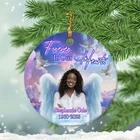 Christmas Forever In Our Heart Ceramic Ornament. Custom Memorial Christmas Ornament. Custom Memorial Christmas Forever In Our Heart Ornament If you need to buy more, please inbox us We have two material options (Ceramic & MDF), please read the product description as below to choose your favorite options. MDF Ornaments 1-sided design. Print type: Sublimation printing. Crafted from durable MDF with a high-gloss plastic finish so your designs last a lifetime. Shapes: Round, star, heart and oval . Product Dimensions: Circle & Heart, 2.75” tall; Oval & Star, 3.25” tall. Ships with a festive gold cord for easy hanging. CERAMIC Ornaments 125" (3mm), 2.75" height (circle), thick high-quality porcelain One-sided print Hole for the hanging string Gold-toned string included Available in 4 shapes - Snowflake, Star, Heart and Circle The height of the hole can slightly deviate Shipping, Return and Refund Policy On average, merchandise is produced and shipped from our facility 2-4 business days after purchase. Standard Shipping: 5-7 working days for USA. Please contact us if you have any dissatisfaction with the item you buy so that we give you the solution. It is easier for us to handle your issue if you send us the proof like an image. We can replace another within 30 days without fee if the item is defective, damaged, or an error is made on our end.
