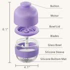 【USB-C Rechargeable&Wireless Design】The mini food processor has a built-in lithium battery, which can be easily charged via the type-c charging port. If you are tired of bulky corded electric food chopper, this compact battery operated food processor is a good alternative, perfect for small kitchen, RV, picnic or travel. 【Small But Fast Vegetable Chopper】This portable food processor features a powerful motor and 3 sharp stainless steel blades for evenly and quickly chopping foods. With a press on the top button, this wireless garlic chopper can get onion, garlic, fruit, veggie, meat, nut, chili and more different types of foods finely processed within just seconds. 【Safe To Use】This usb rechargeable chopper cutter equips a safety lock. Only when the bowl lid is secured and the motor securely sits on it, will the chopping blades spin. With a food grade glass bowl and 420 stainless steel blades, this electric meat blender grinder is aimed to protect your family’s health. 【Easy To Clean】 Sunfuny multifunctional battery powered chopper kit comes with 1*battery chopper motor, 1*bowl lid, 1*350ml glass bowl, 1*silicone sleeve, 1*blade set, 1*silicone bottom mat, 1*usb-c cable. All parts are removable for easy hand wash, except for the motor. (Silicone sleeve and silicone bottom mat are attached to the bowl already, but can be removed) 【We Got Your Back】Sunfuny purple cordless mini chopper is not only a practical small kitchen appliance, but also an ideal gift choice. We stand behind our portable veggie chopper mixer with one year guarantee, feel free to reach out if you have any problem with this glass bowl food processor.