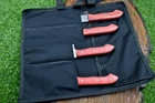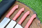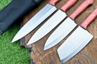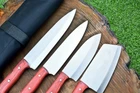EXCLUSIVE HANDCRAFTED J2 STEEL CHEF KNFIE SET, CHEF KNIVES, KITCHEN KNIVES SET, 4 PCS SET, CAMPING KNIFE, CAMPING KNIFE EDC, Product Details: Overall Knives Length: Approximately 13", 11", 10", 9" inches Blade Length: 8", 7", 6", 5" Blade Material: Genuine J2 Steel Blade Hardness: 54-58 HRC Size Verification: To help you easily determine the size, we've included images with a scale for precise dimension reference. Thank you for your understanding. We appreciate your consideration. Included Accessories: High-quality synthetic fabric (nylon) roll bag with reinforced stitching for durability Handle Material: Wood scales fastened with brass pins. For International Customers: We kindly advise our international customers to familiarize themselves with their country's regulations prior to making a purchase. If customs in your region request customs duties, please be prepared to cover these costs. Regrettably, we cannot assume responsibility, nor issue refunds in such cases. AGE LIMITATION: Please note that we exclusively sell knives to individuals who are 18 years of age or older. Additional Details: Leather Sheath (if pictured): Rest assured, this item comes with a superior-quality, sheath. Crafted with meticulous hand-tooling and stitching, it exemplifies fine craftsmanship and is designed for exceptional durability. The added stitching ensures it withstands years of demanding use, providing reliable protection for your knife throughout its lifetime. Care and Maintenance: When necessary, use a Diamond Wet Stone or a superior sharpening tool to maintain a 20-degree blade edge. After use, clean the item with soap and water, ensure thorough drying, coat it with gun oil, and store it separately from the sheath. Leather absorbs moisture from the air and can lead to blade rust if stored improperly. Customer Feedback: Your satisfaction and feedback are of utmost importance to us. We genuinely appreciate your positive reviews! When assessing shipping time, please consider international transit. Your recognition bolsters our confidence to enhance our services. If you encounter any issues with your order or product dissatisfaction, please reach out to us first. We are committed to resolving any concerns to your satisfaction and kindly request you not to leave neutral or negative feedback. Payments & Returns: All accepted eBay payment methods are available for this purchase. Our return policy typically extends to 14 days. Shipping and Handling: We offer free shipping on all our products (In the USA) Tracking Info: The buyer will receive the tracking number via email (if available). You can also track the shipment in the "Order Details" section on eBay. USPS UPS DHL updates tracking information nightly (if available). Contact: Feel free to contact us anytime via eBay messages. We are dedicated to responding to your inquiries within 24 hours and providing the best possible assistance.