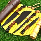 FULL TANG CUSTOM HAND MADE CARBON STEEL BLADE CHEF KNIFE KITCHEN KNIVES SET Wood Handle This superb design knifes is hand made. Blade of this knife has a nice file work and is made of high carbon steel and hardness 55-58 H R C . This robust knife is lab tested under intense conditions, the balance and shape of this knife ensures perfect grip. Overall Pieces : 4 Cleaver Knife : Blade 6.5" Inches - Handle 5" Inches Fillet Knife : Blade 5.5" Inches - Handle 5" Inches Chef Knife : Blade 7.75" Inches - Handle 5.25" Inches Steak Knife : Blade 4" Inches - Handle 4.75" Inches Warning: Keep fingers clear of blades. Store away from children.
