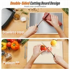 Cutting Board Double Sided, 304 Stainless Steel Cutting Board for Kitchen, PP Ch Versatile Dual-Sided Design: This cutting board features a unique double-sided construction, with one side made of durable stainless steel, for cutting raw and cooked meats. The other crafted from polypropylene (PP), for cutting vegetables and fruits. High Quality And Long-Lasting: Made with high-quality food grade materials, our cutting board is designed to withstand daily use. Its sturdy stainless steel surface resists dents, while the robust PP side ensures longevity, making it a reliable addition to your kitchen tools. Easy To Clean And Store: Our stainless steel cutting board is not only sleek but also incredibly easy to clean. Simply rinse clean after use. The PP side is equally low-maintenance, making meal prep quick and efficient. The cutting board comes with a stainless steel handle for easy carrying and hanging. Silicone Edging for Stability: Equipped with silicone edging along the perimeter, this cutting board provides excellent anti-slip capabilities. Additionally, the silicone edge prevents juices from meat, fruits, or vegetables from spilling over the rim, keeping your kitchen countertop clean and tidy. Generous Size for All Your Needs: Measuring 16.1×10.2 inches, this large cutting board offers ample space for chopping, slicing, and dicing a variety of ingredients. The built-in garlic grinding area saves cooking time. Whether you're preparing a family dinner or hosting a gathering, you'll appreciate the generous surface area for all your culinary creations. Upgrade your kitchen experience with our Double-Sided Stainless Steel Cutting Board, where functionality meets style! Terms of Sale and Feedback: Feedback is extremely important to us and eBay If you are satisfied with our transaction, please take a moment to leave Positive Feedback. YOUR Satisfaction is our #1 Priority! If there are any issues, PLEASE contact us BEFORE leaving a neutral or negative rating so that we may resolve any concerns. We PROMISE we can make you happy if you give us a fair chance.
