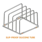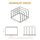 【Large Size】 Our Cutting board organizers are 6.1x 6 x 4 inches , you can use it to store cutting boards, chopping boards, plates for kitchen essentials, cookie sheets, and recipes, etc. It holds items securely and keeps them organized. 【Sturdy Structure】This cutting board rack is made of thick 304 stainless steel,very handy to put it on countertop and in cabinet to store cutting boards, helps save valuable countertop space in your kitchen, makes countertop neat and clean, it can last long time without the worrying to rust. 【Non Slip】There are four rubber tubes on the bottom to prevent the rack slipping around on the countertop, and the cutting boards can be inserted into the slots either vertically or horizontally. 【Functional & Versatile】 Perfect for cookware, but also try this item in your home office or craft room to keep notebooks, notepads, printer paper, books, and other items organized and easy to find; Great for separating gift bags and tissue paper too. 【Measure your cutting boards before buying】The cutting board storage rack has 4 storage slots, the 2 slots are 1.0 inches wide, and the 2 slots are 1.2 inches wide, can hold up more than four pieces thin cutting boards or more of thinner ones.Please note that this storage rack is not suitable for thick kitchen utensils that are thicker than 1.2 inches, such as pots and deep bakewares.