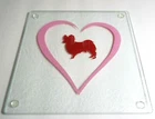 Papillon Dog, Pink Heart Vinyl Decals on Square Glass Cutting Board, Dog Lover Gift, Glass Trivet A square glass cutting board has been customized with a red vinyl Papillon design within a pink heart. The square cutting board is 7.75 X 7.75 inches and has 4 feet. Hand Wash