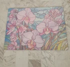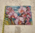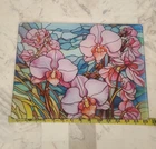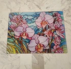 The new glass cutting board is stained with flowers on a cutting board. This cutting board is textured and tempered glass that is recommended for hand washing only. It has vibrant colors that will be a good food display or just a cutting board to chop fruits and veggies on.