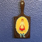 This vintage cutting board is a charming addition to any Americana-themed collection. Hand painted on wood, this piece features a retro red head design with charming initials. The colorful multi-color design adds a pop of color to any kitchen or decorative display. Crafted in the United States, this item is an original piece, dating back to the post-1940 era. Perfect for collectors of decorative and other decorative collectibles. Add this unique piece to your collection today! Cute painted cutting board A few minor dings and marks Such a cute little lady!