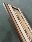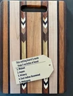 Cutting board is hand made and hand sanded out of hard woods. It is 10 1/2" x 7 1/2" x 3/8". See our store for more choices. The board is food safe. Has several coats of food safe oil on it and buffed with beeswax. Made with; Walnut Aspen Hickory Mahogany East Indian Rosewood