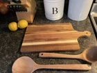 This cutting board is a must-have for any kitchen. Handmade with care in Ohio, this medium-sized rectangular board is made of high-quality Açaí wood. With its unique brown color and natural grain pattern, this cutting board is not only functional but also a beautiful addition to any kitchen decor. The board is designed for easy use and care, with features like hand wash only and a sturdy construction that can withstand regular use. Whether you're preparing your meals or snacks, this cutting board is the perfect choice. So why wait? Add this beautiful, handmade cutting board to your kitchen today! Comes with a hand made serving spoon and ladle too! We will ship all three items once we receive payment. Thank you for your support.