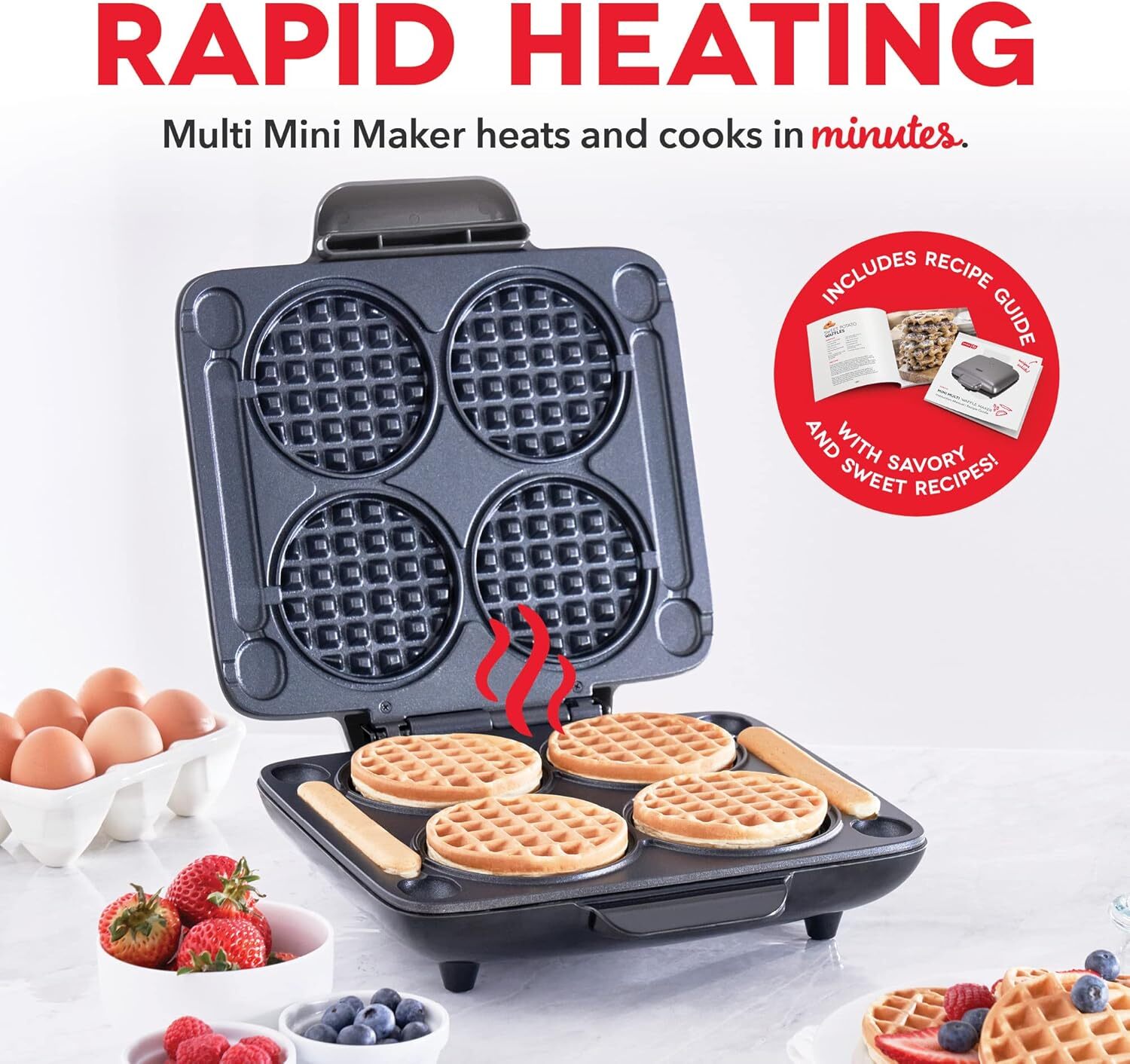 DASH Multi Mini Waffle Maker - Four 4” Waffle Molds, Nonstick Waffle Iron with Quick Heat-Up, Nonstick Surface - Perfect Mini Waffle Maker for Kids and Families, Just Add Batter About this item MINI WAFFLE MAKER: This DASH Multi Mini Waffle Maker features four 4” waffle molds on a single plate, allowing you to make mini waffles four at a time - ideal for family breakfast preparation or the perfect party treats. EFFICIENT & USER-FRIENDLY: Simply plug it in and add batter. The built-in indicator light on this family waffle maker notifies you when the pan is ready for use in minutes, while the easy-to-use handle and non-slip feet provide for a safe experience. HIGH QUALITY NONSTICK SURFACE: This small waffle maker comes with a superior quality PTFE nonstick surface and includes built-in drip channels ensuring your mini waffles come out perfectly every time, while making clean-up a breeze. VERSATILE USE: With our dual mini waffle iron, you can create large batches of waffles and freeze them for future use, providing a convenient solution for busy mornings or sudden cravings. From the manufacturer