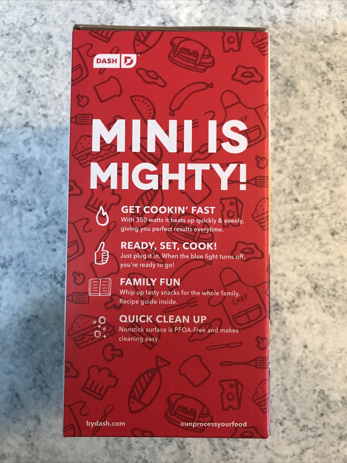 Dash Mini Waffle Maker 4 inch Cooking Surface Non Stick 350 Watts. Get Cookin’ fast. When the blue light turns on it is ready to go. Easy clean up. Convenient, and doesn’t take up a lot of space.