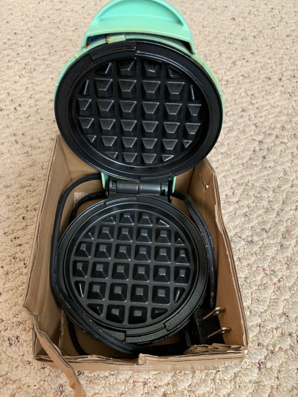 The Dash Mini Waffle Maker is a round Belgian waffle maker in green color. It is powered by electricity with a power of 350W. The specific model is Dash DMW001AQ. It is a small kitchen appliance suitable for making delicious waffles quickly and easily.