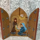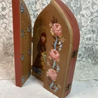 This beautifully crafted shelf sitter is a perfect addition to any home decor. The intricate hand-painted details on the folding wooded doors make it a unique and eye-catching piece. Made in the United States, this handmade item is a great way to add a touch of personalized charm to your space. The California Prop 65 Warning does not apply to this item.