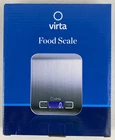 This is a modern digital kitchen scale by the brand Virta, featuring a silver stainless steel design with a rectangle shape. It has a capacity of 11 lbs. (5kg) and a back-lit LCD display for easy reading. The scale is battery-powered and includes features like a low battery indicator, automatic shut off, and is easy to clean. It is lightweight and ideal for measuring food, meat, and ingredients for baking and cooking.