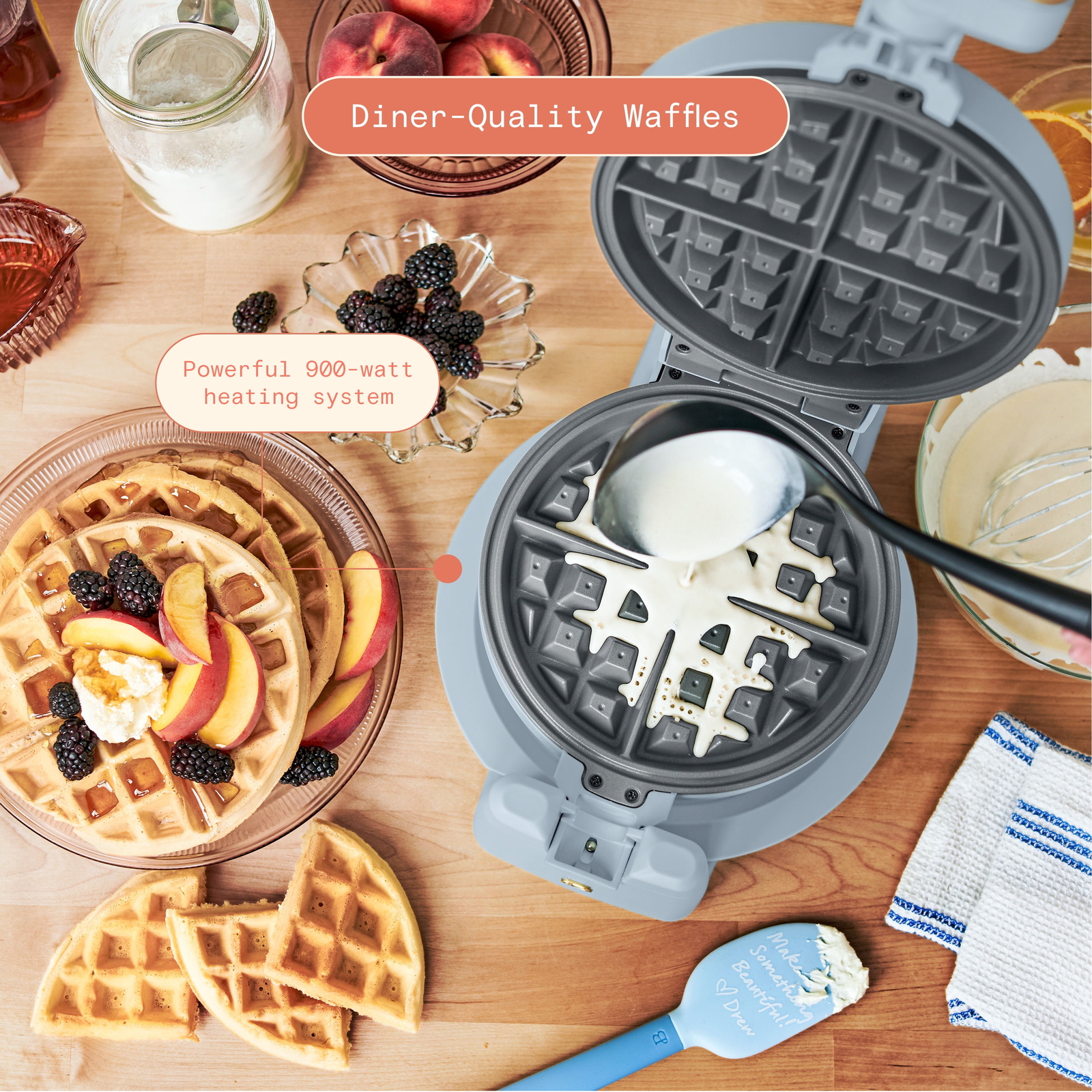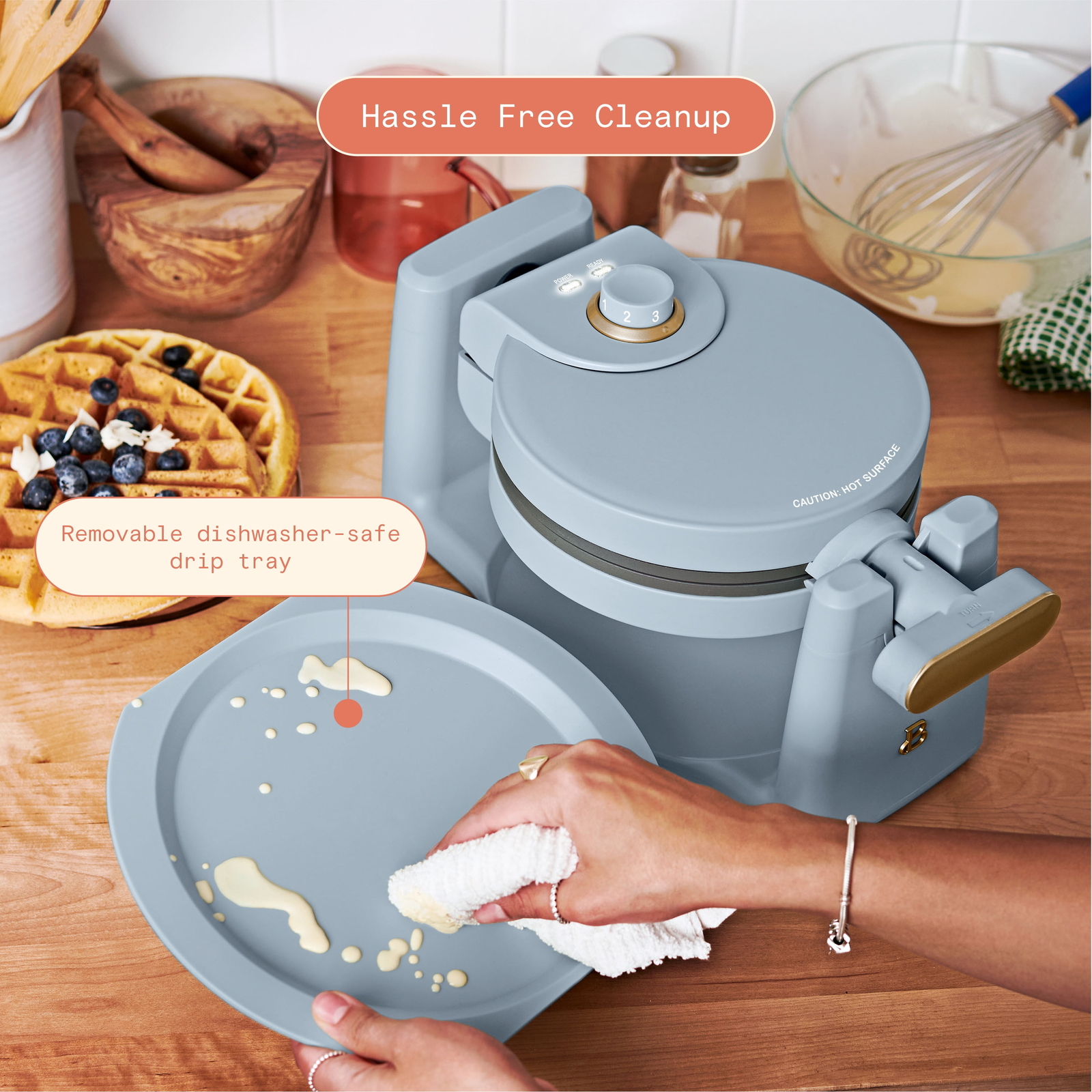 Crush your brunch goals and serve the family light, fluffy and crispy on the outside Belgian waffles right at home with the Beautiful Rotating Belgian Waffle Maker. A powerful 100 watt heating system and easy-to-use rotating mechanism combine to cook five, evenly-cooked round 1”-thick restaurant-quality waffles in only 10 minutes. With seven adjustable browning control settings, you’re in control of cooking each waffle to just the right shade to please all your guests (or yourself!). The waffle plates feature a non-stick coating made without PFOA and PFOS for easy food release and clean up. Plus, its compact size (the handle rotates and folds in) and genius cord wrap makes storage simple. A ready indicator light and cool-touch handle round out the features of this must-have waffle maker. Available in Cornflower Blue with signature gold accents. . Condition: new. Makes five 1” thick restaurant-style Belgian waffles in under 10 minutes Rotates for evenly cooked waffles every time Seven browning settings cooks waffles to your preference Powerful 1000-watt heating system Non-stick coating made without PFOA & PFOS for easy food release and clean up Dishwasher-safe removable drip tray Handle rotates and folds for compact storage Long-lasting metal housing with matte premium finish Comes in Cornflower Blue Condition: new