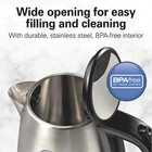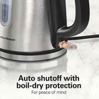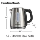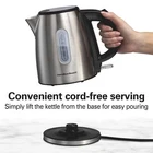 The Stainless Steel Kettle makes it easy to prepare tea, instant coffee, hot cocoa, oatmeal, ramen and more. It has 1500 watts of power for ultra-fast heating, and you can heat 1.2 liters or 5 cups of water faster than a microwave and safer than a stovetop kettle. It's easy to use. Just fill the kettle with water, plug it in and press down the on/off switch near the base. Water heats up quickly and when it reaches a boil, the kettle and indicator light automatically turn off. You can effortlessly monitor the water level with the easy-view water window, and the stainless steel, BPA-free interior provides durability and peace of mind. For cord-free serving, the kettle lifts off the base to let you pour and serve at the table or anywhere you're prepping hot beverages or meals. For easy storage after use, wrap the cord under the base to keep the cord out of the way. Includes a removable mesh filter that helps prevent mineral scale from getting in your cup. ULTRA-FAST HEATING WITH 1500 WATTS: This electric kettle is faster than a microwave and safer than a stovetop kettle. Make a quick cup of tea or instant coffee anytime without the long wait — perfect for hectic mornings or anytime you need hot water fast. AUTO SHUTOFF WITH BOIL-DRY PROTECTION: The automatic shutoff function turns the stainless steel kettle off when water comes to a boil, and the boil-dry protection function keeps the kettle from scorching if the water level gets too low. EFFORTLESSLY MONITOR WATER LEVEL WITH EASY-VIEW WATER WINDOW: With the easy-view window, you'll always know how much water is in the tea kettle or how much water you're adding. The kettle's wide opening makes filling and cleaning easy. SPACE-SAVING COMPACT SIZE IS PERFECT FOR 5 SERVINGS: This compact kettle holds a total of 1.2 liters or 5 cups of water, so it's perfect for preparing up to 5 cups (8 oz. each) of your favorite hot beverages. WIDE OPENING FOR EASY CLEANING: This electric tea kettle's wide opening makes filling and cleaning easy. The stainless steel, BPA-free interior provides durability and peace of mind.