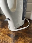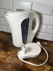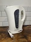 This electric tea kettle has a 1.7 liter capacity and is made by Proctor Silex. It is white in color and the model number is K30. The assembled product dimensions are 11.25 x 9.75 x 5.50 inches. This tea kettle is perfect for any tea lover and is easy to use. It is sold without the original box and is in working order.