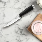 With a chic soft-grip, black handle, the Epicure 4 Piece Steak Set by provides the balance and ergonomics needed to cut efficiently. Featuring a timeless design with exceptionally sharp stainless steel, serrated blades, polished to a mirror finish. Epicure will provide reliable dining year after year, and looks great in a casual or formal dining setting. HOLLOW-GROUND SERRATED EDGE – Factory ground to a precision edge for clean cuts; crafted from very high quality stainless steel that resists corrosion, rusting and pitting. SOFT GRIP HANDLE – Ergonomically designed offering comfortable, safe and slip-resistant cutting. UPGRADE YOUR CUTLERY – For a twist on the traditional, the Epicure Steak Set offers a bit of contemporary flair to place setting. Hand wash Recommended Set Includes: (4) 4.5" Steak Knives